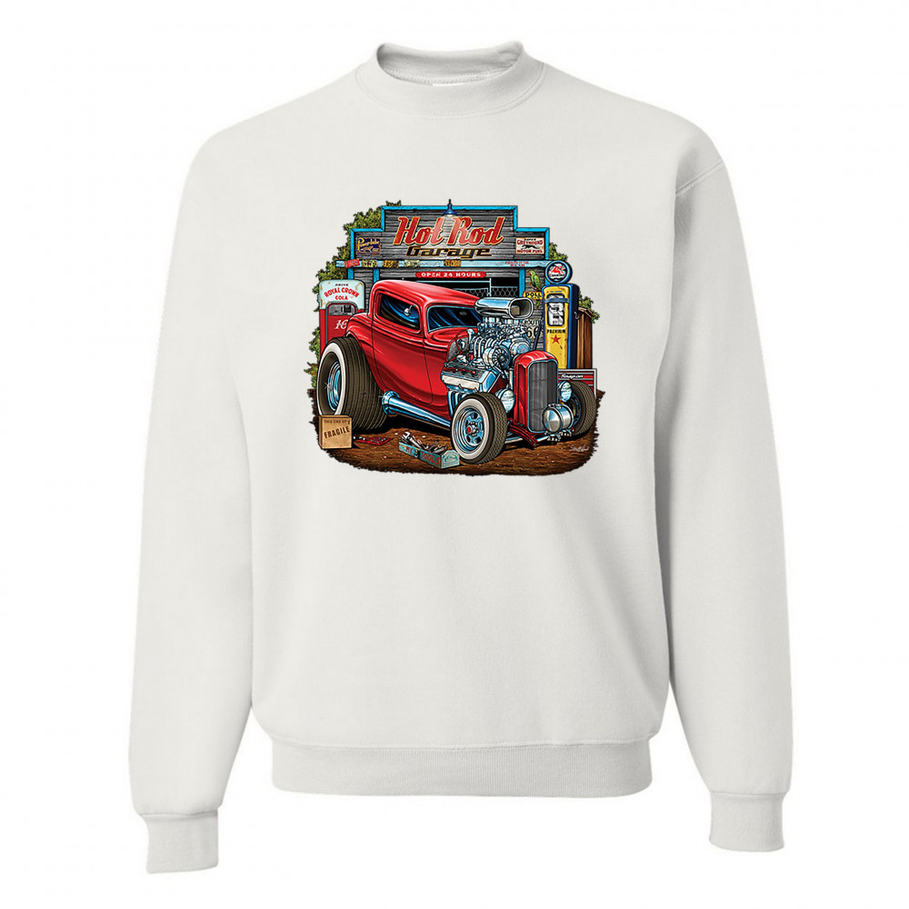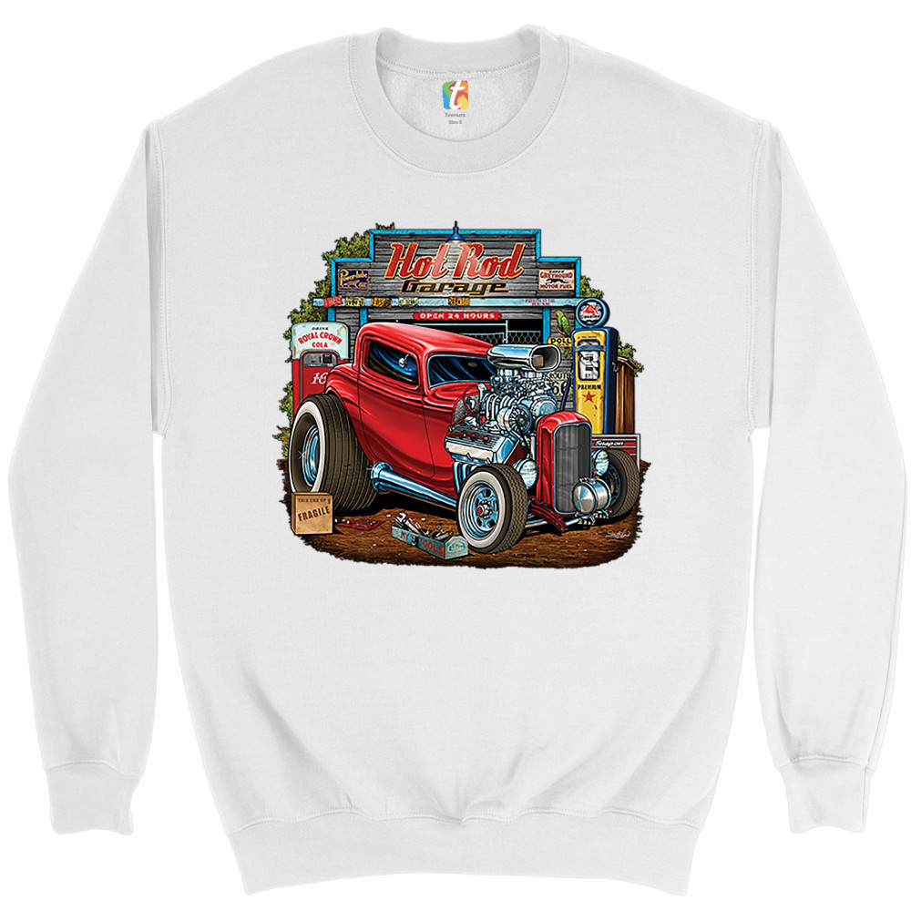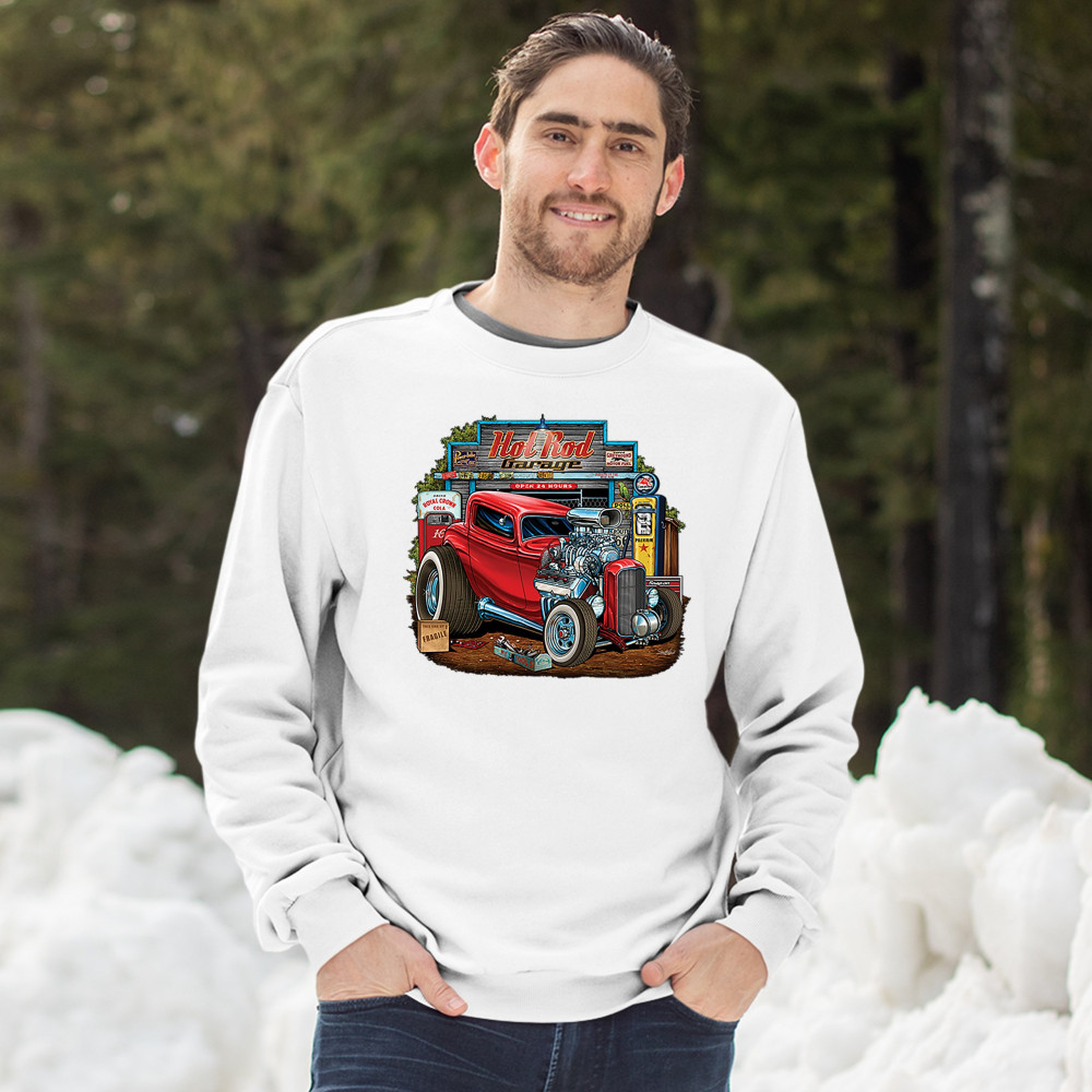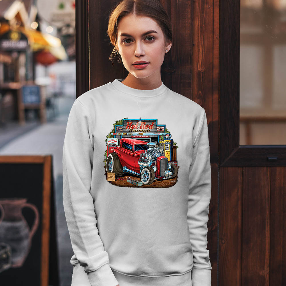 A print featuring a vintage hot rod with an exposed engine and plus-sized rear wheels. In the background there is a garage with a gas station and a sign that says: "Hot Rod Garage". A great choice for a fan of customized American classic cars and hot rods
