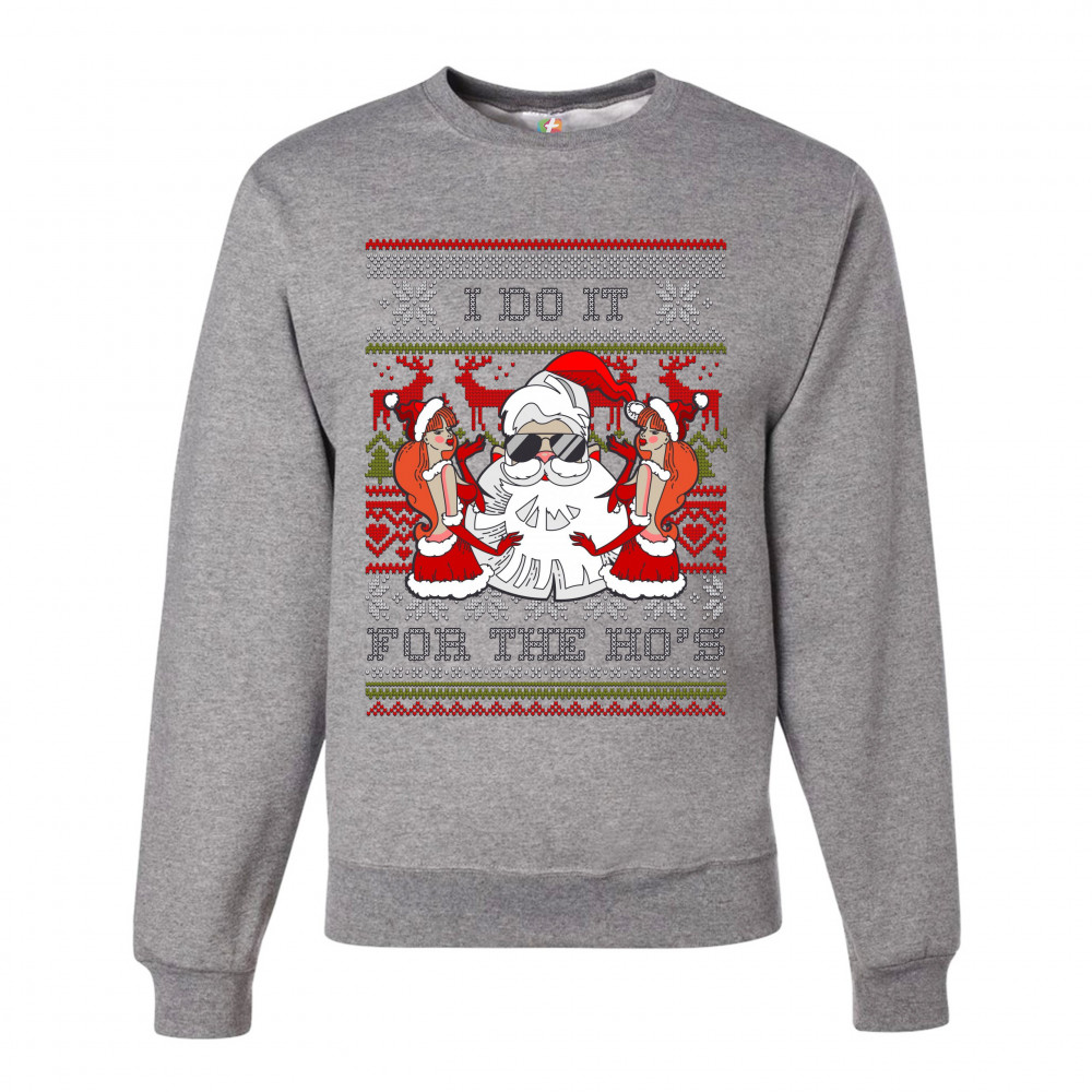 A funny print saying: "I do it for the ho's". It features a badass Santa Claus wearing sunglasses and two sexy girls in revealing Christmas outfits leaning on Santa's beard. The print is decorated wit the ugly sweater pattern in the background. Amazing ch
