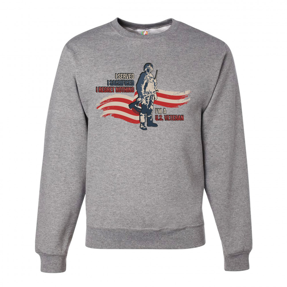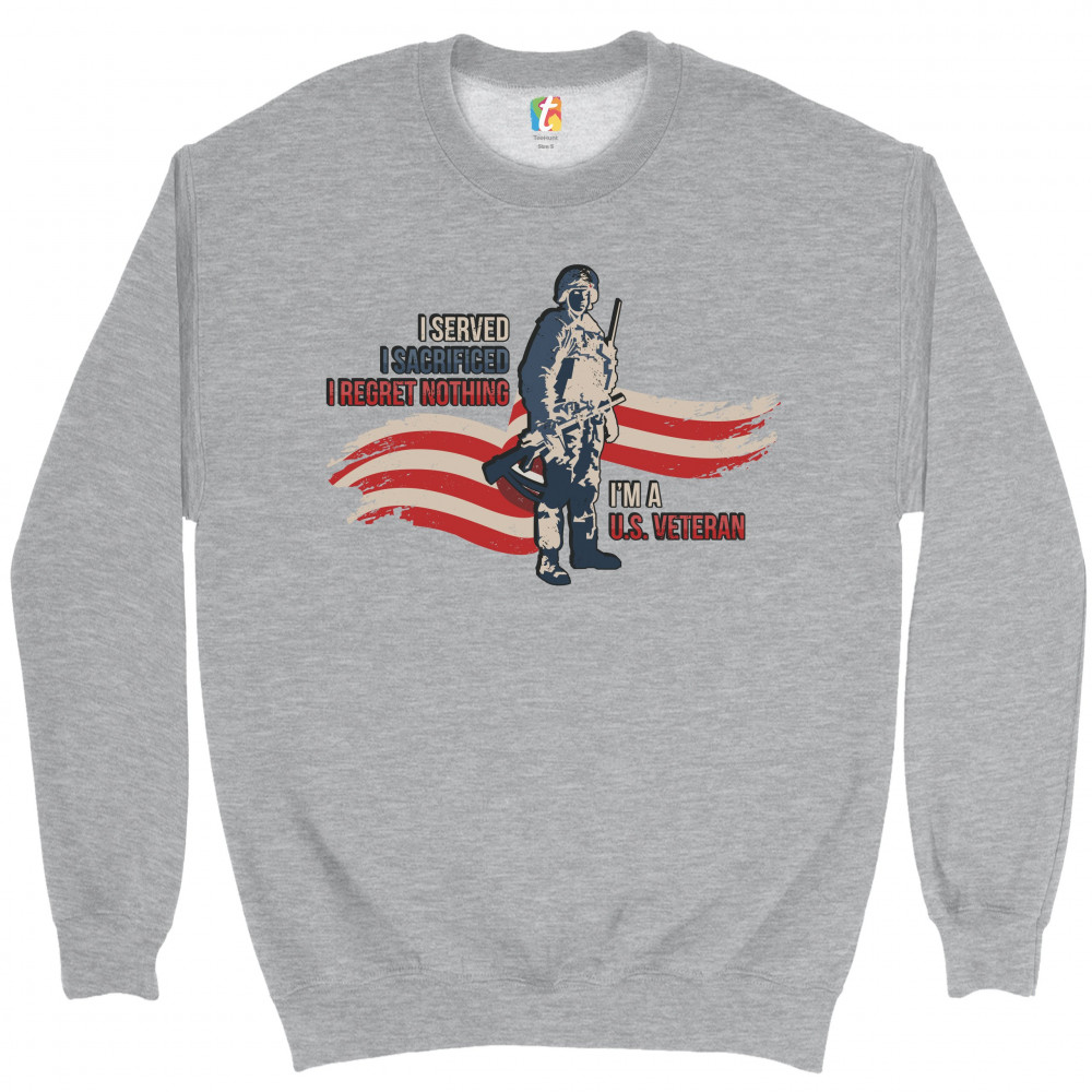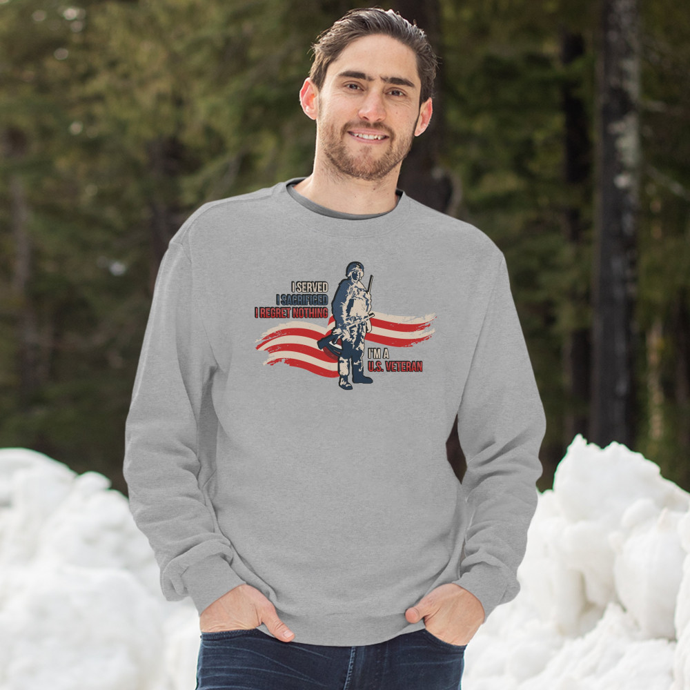 A patriotic print featuring a red-and-white stripe in the background and a soldier holding a rifle. The print says: "I Served I Sacrificed I Regreat Nothing I'm a U.S. Veteran". Great choice to wear on Independence Day or any other patriotic holiday.