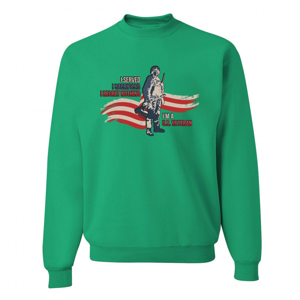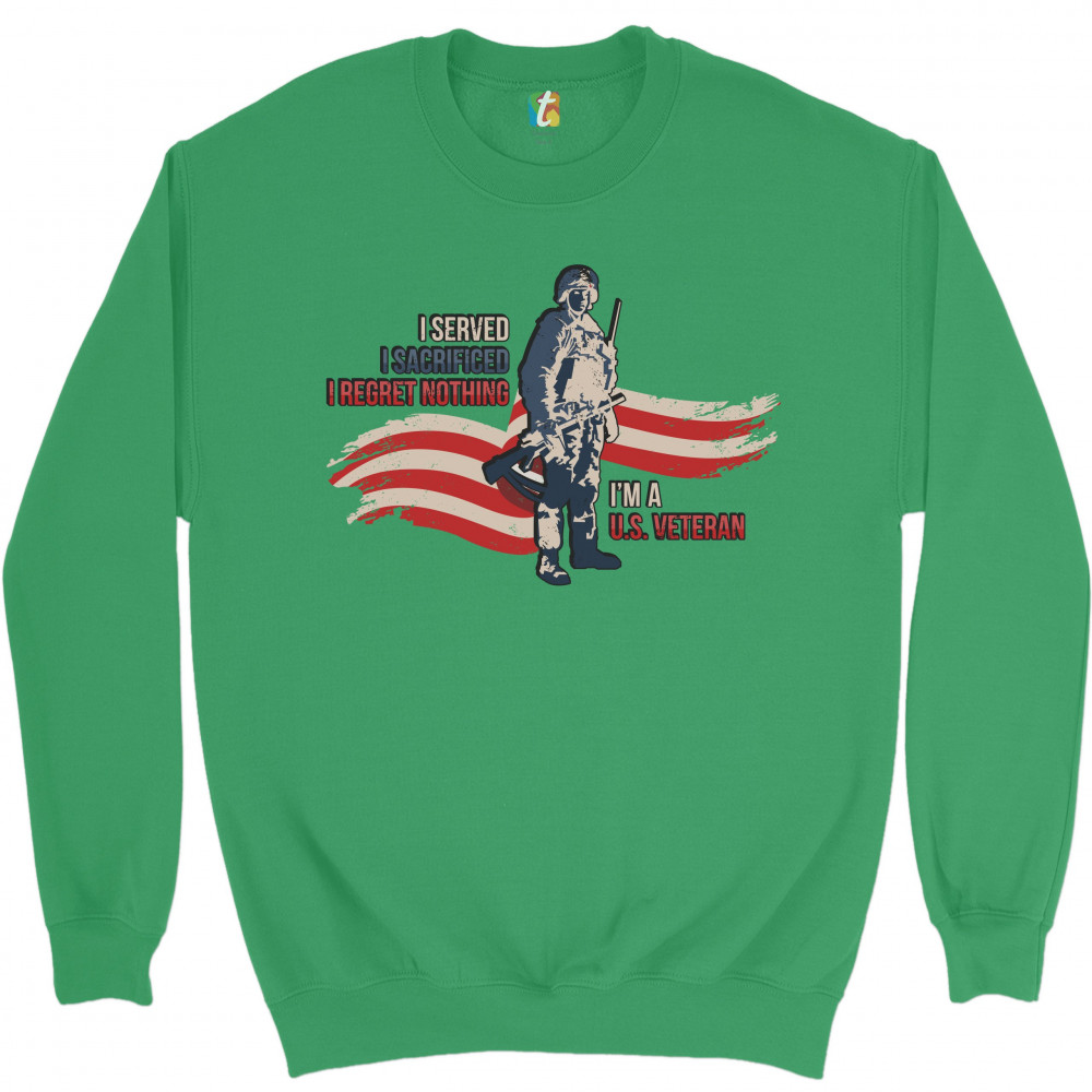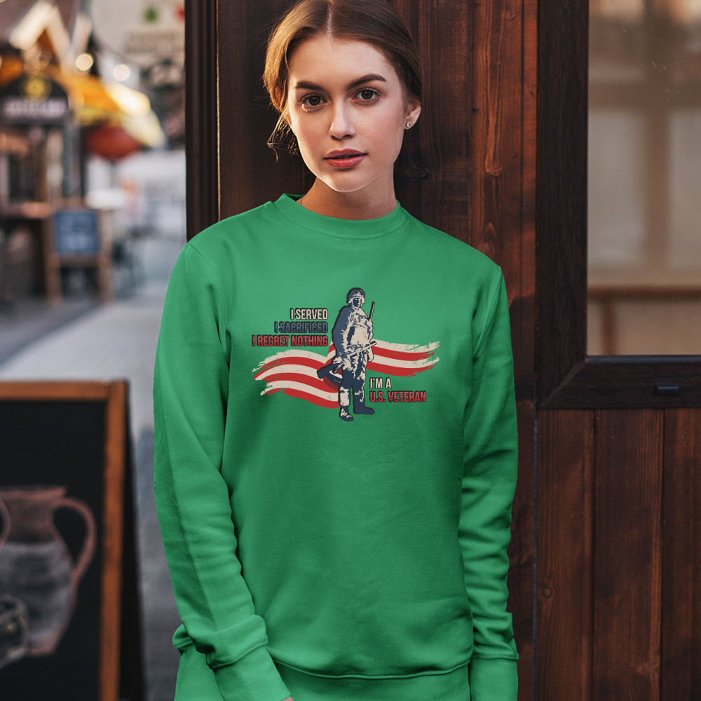 A patriotic print featuring a red-and-white stripe in the background and a soldier holding a rifle. The print says: "I Served I Sacrificed I Regreat Nothing I'm a U.S. Veteran". Great choice to wear on Independence Day or any other patriotic holiday.