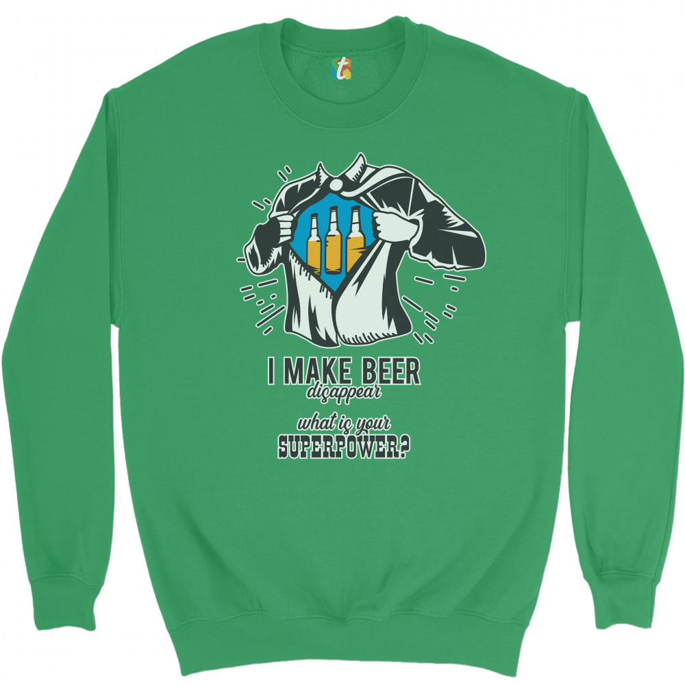 A funny print featuring a torso of man, who is ripping his shirt, exposing a picture of three bottles of beer. Underneath the picture the print says: "I make beer disappear. What is your superpower?". Great choice as a gift for Father's Day celebration.