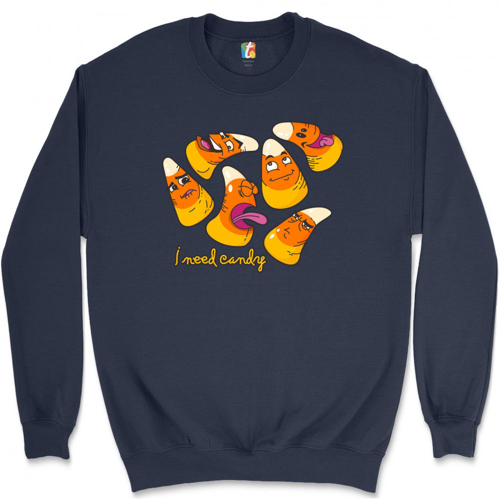 I NEED CANDY sweatshirt happy halloween trick-or-treating funny crewneck navy blue