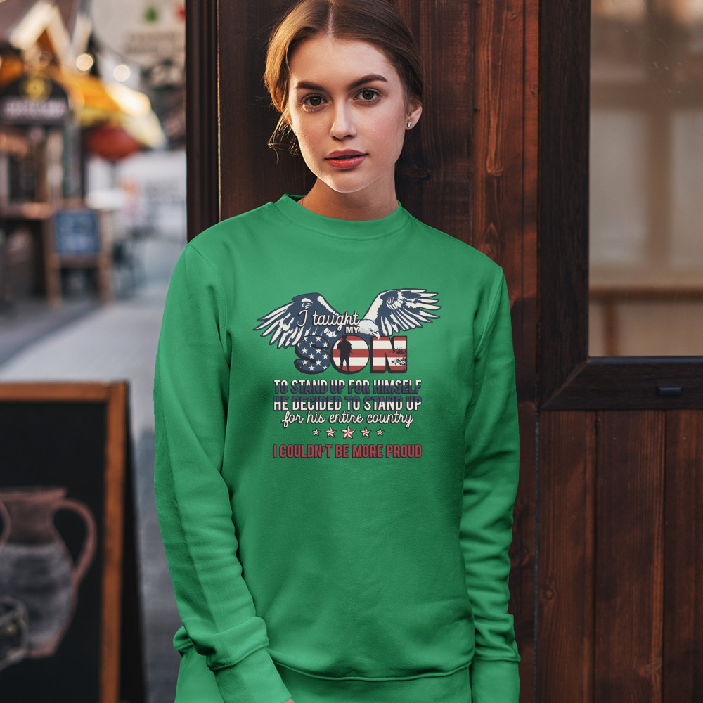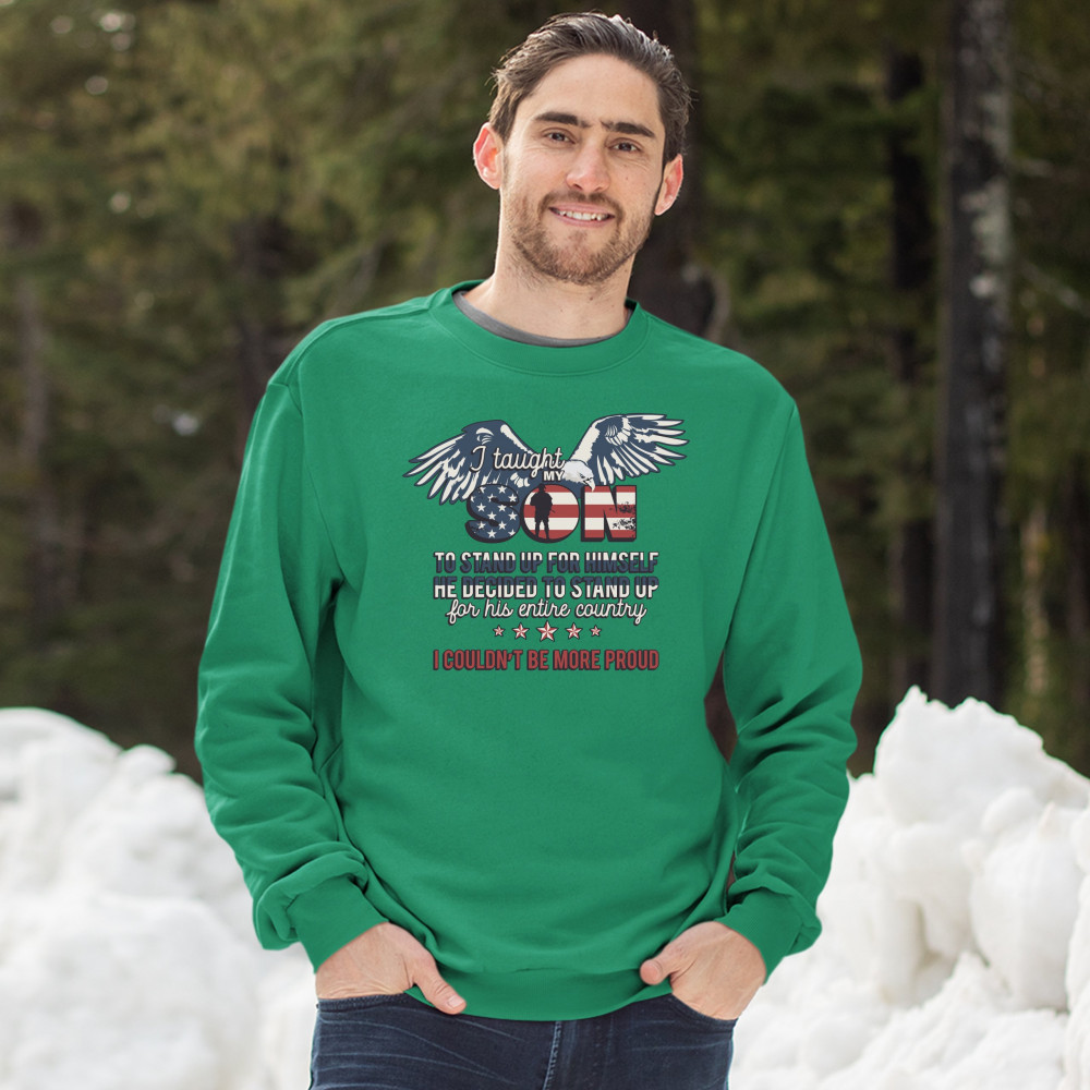 A patriotic print saying: "I Taught My Son to Stand up for Himself, He Decided to Stand Up for His Entire Country, I Couldn't Be More Proud". The print features a bald eagle, several stars and a small silhouette of a soldier inside of a letter "O" in "Son