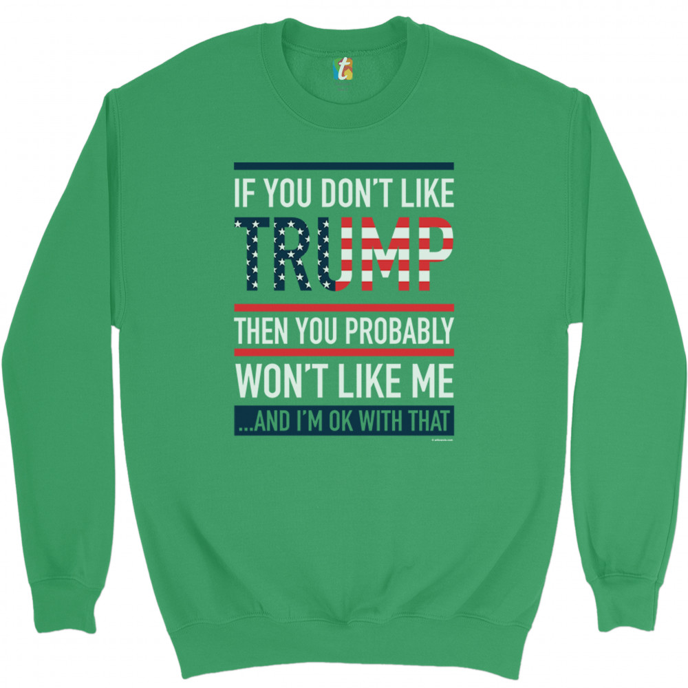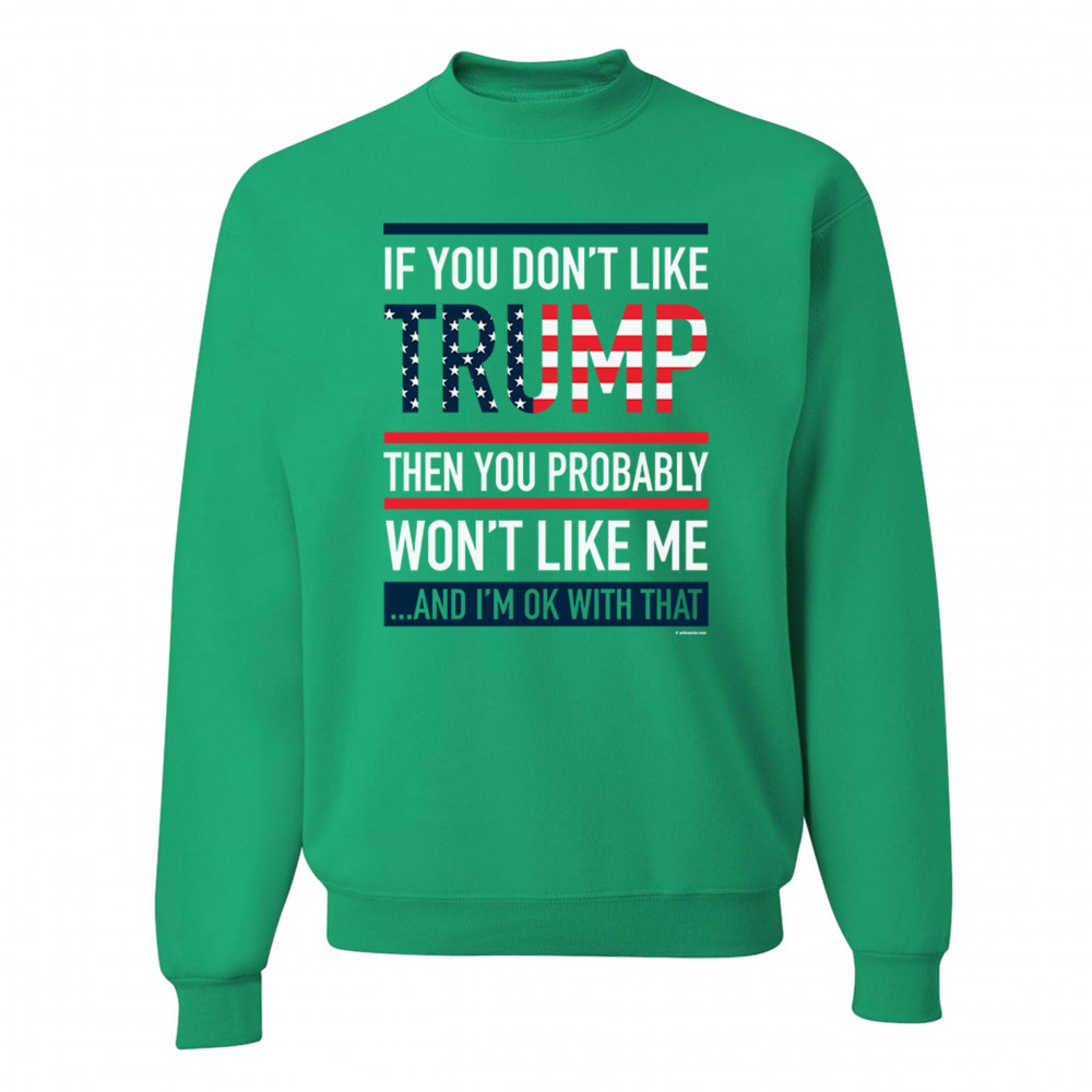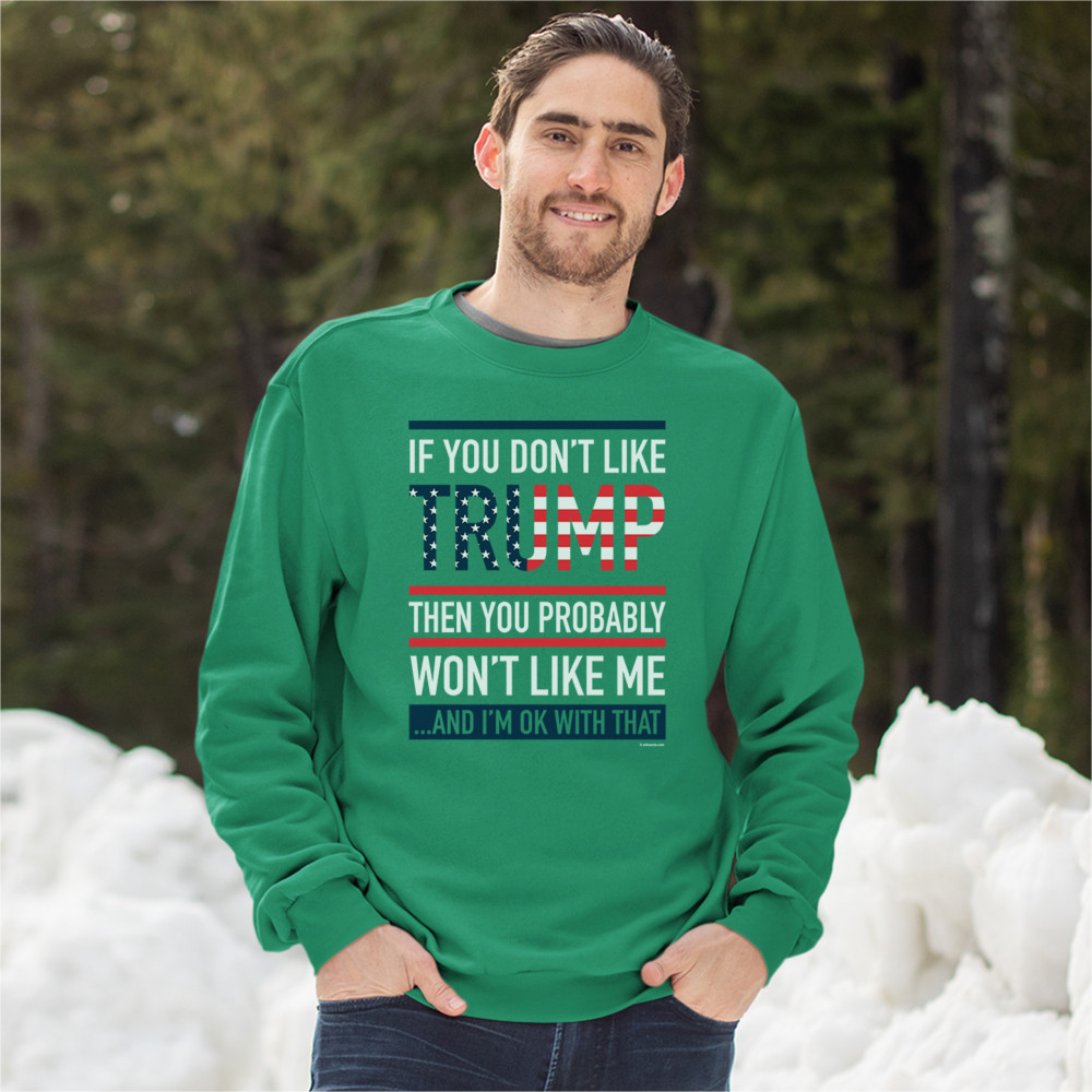 A political print saying "If You don't like Trump then you probably won't like me …and I'm ok with that". The word Trump is decorated with stars and stripes. A great choice to wear for a Trump rally or give as a gift to a Donald Trump and Mike Pence supporter before 2020 presidential elections.