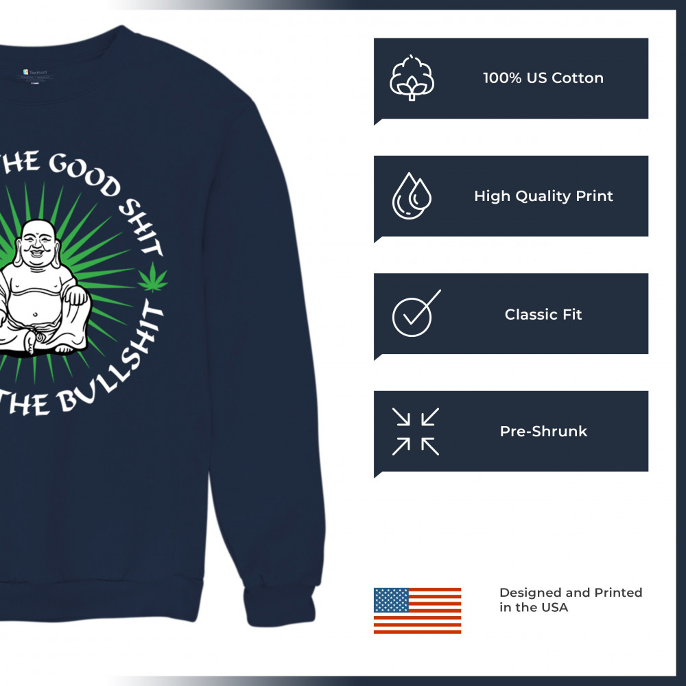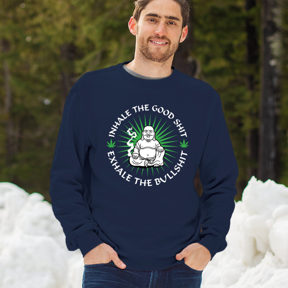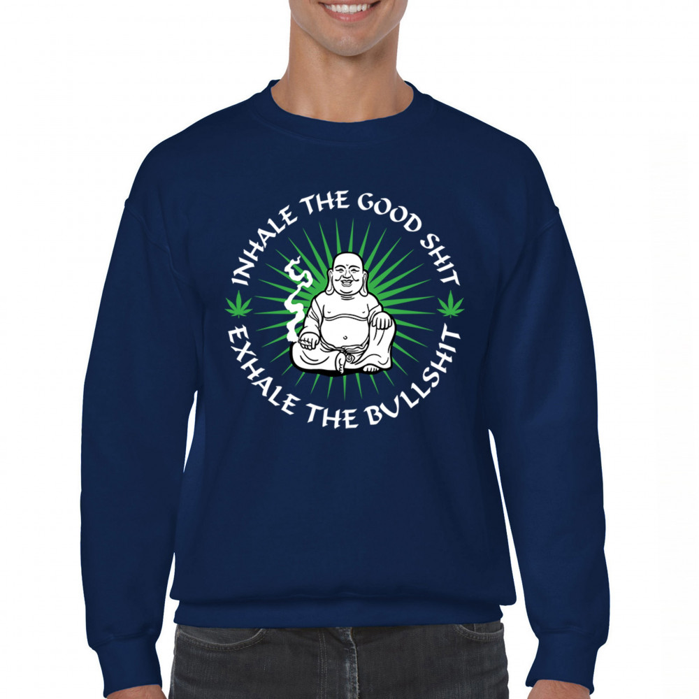 This hilarious and zen-inspired design features a happy Buddha with a joint, surrounded by cannabis leaves. “Inhale the Good Shit, Exhale the Bullshit†delivers chill stoner wisdom with a wink. Ideal for mindful marijuana lovers, 420 fans, or spiritual rebels with a sense of humor and a love for weed.