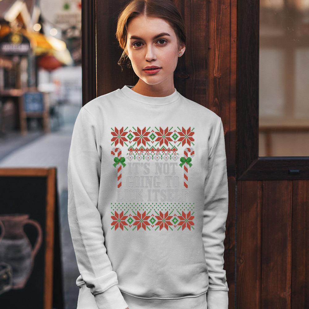 IT'S NOT GOING TO LICK ITSELF sweatshirt ugly sweater christmas crewneck white