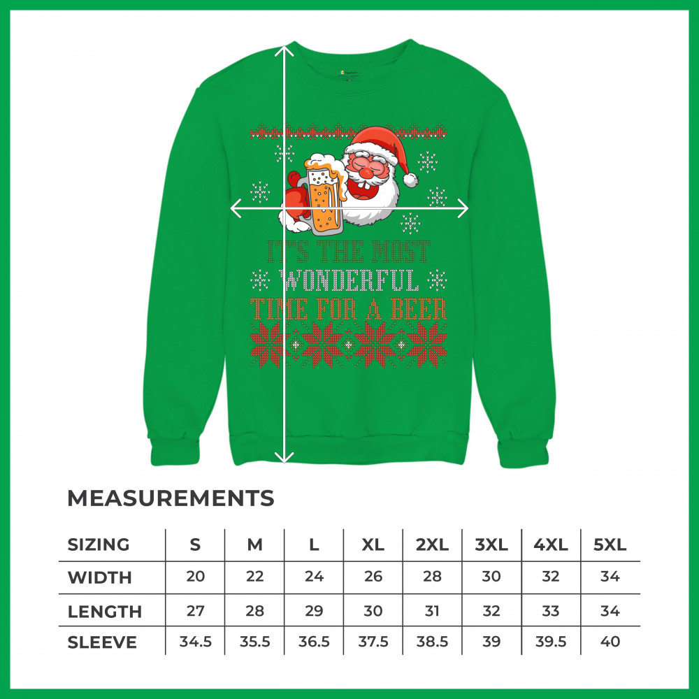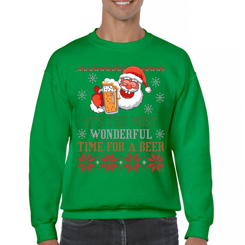 A print saying: "It's the Most Wonderful Time for a Beer" and featuring Santa Claus holding a glass of beer. The print is designed as an ugly sweater. Amazing choice for a single person who wants to make people smile and spread positive vibes on Christmas