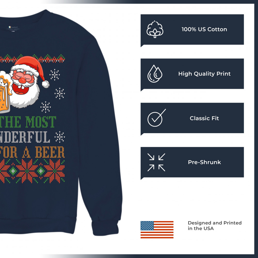 A print saying: "It's the Most Wonderful Time for a Beer" and featuring Santa Claus holding a glass of beer. The print is designed as an ugly sweater. Amazing choice for a single person who wants to make people smile and spread positive vibes on Christmas