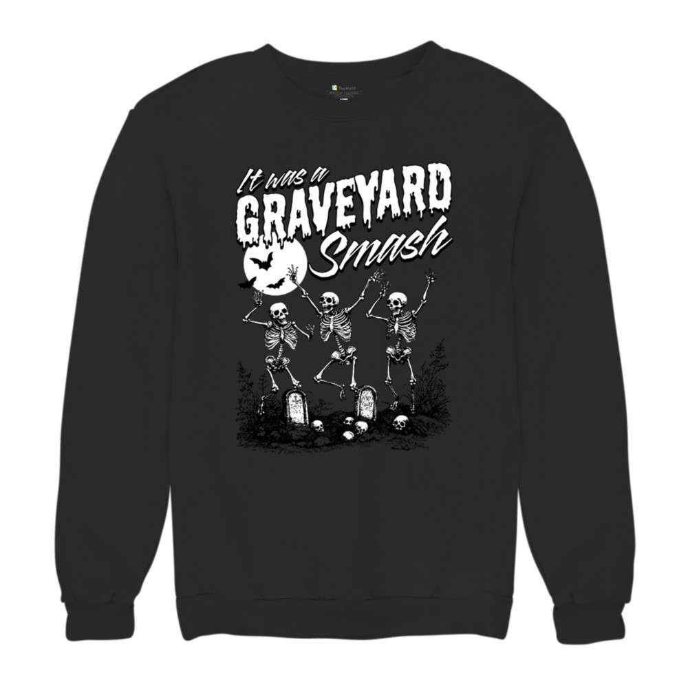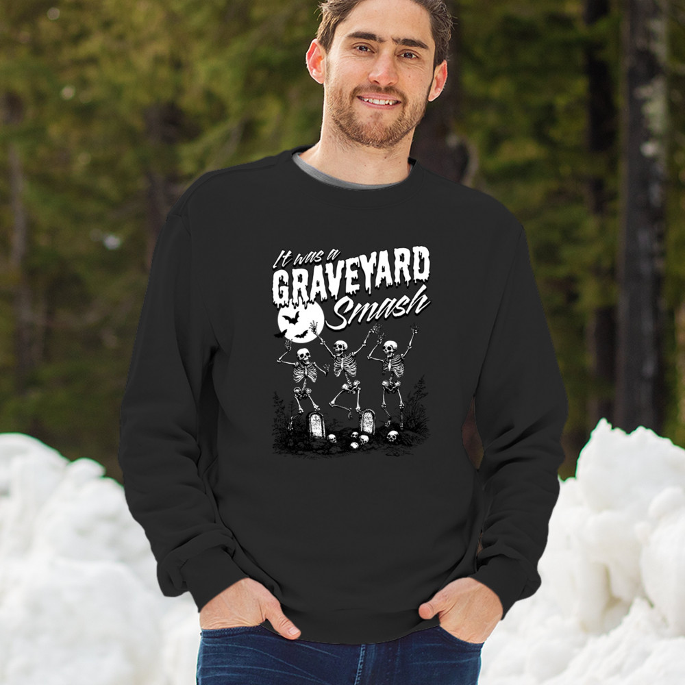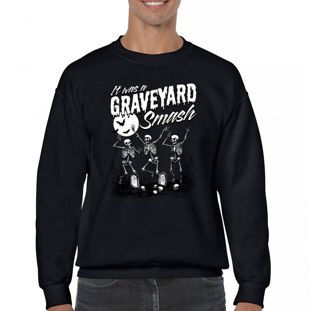 IT WAS A GRAVEYARD SMASH HALLOWEEN SKELETON sweatshirt pumpkin skull crewneck black