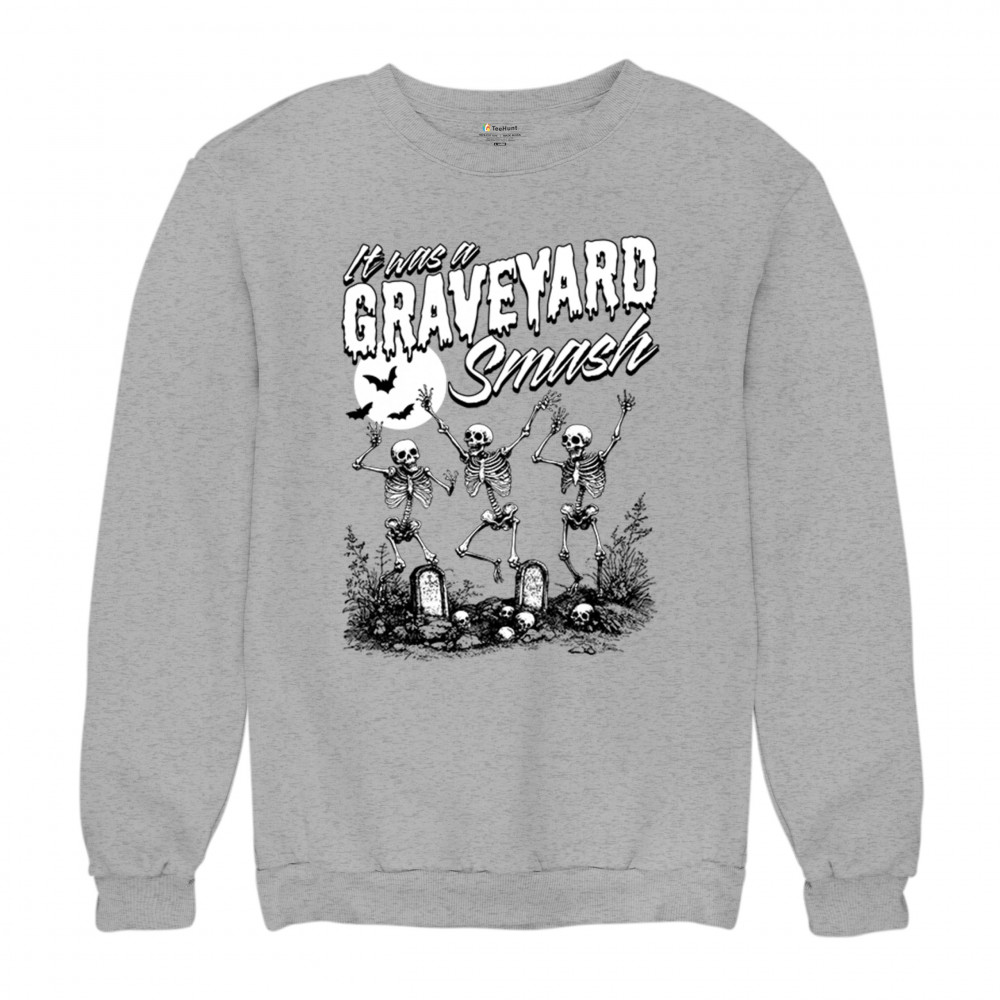 Celebrate Halloween with a fun "Graveyard Smash" design featuring dancing skeletons. Perfect for parties and haunted house events!