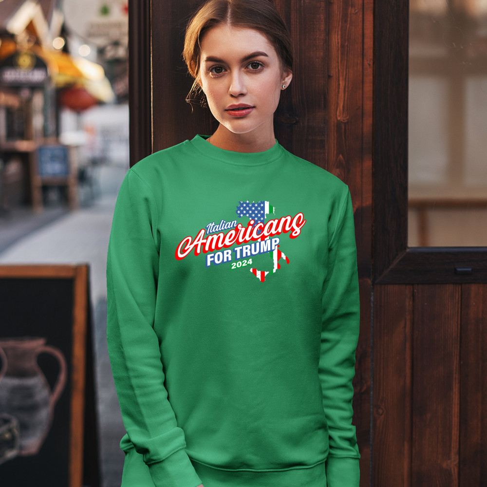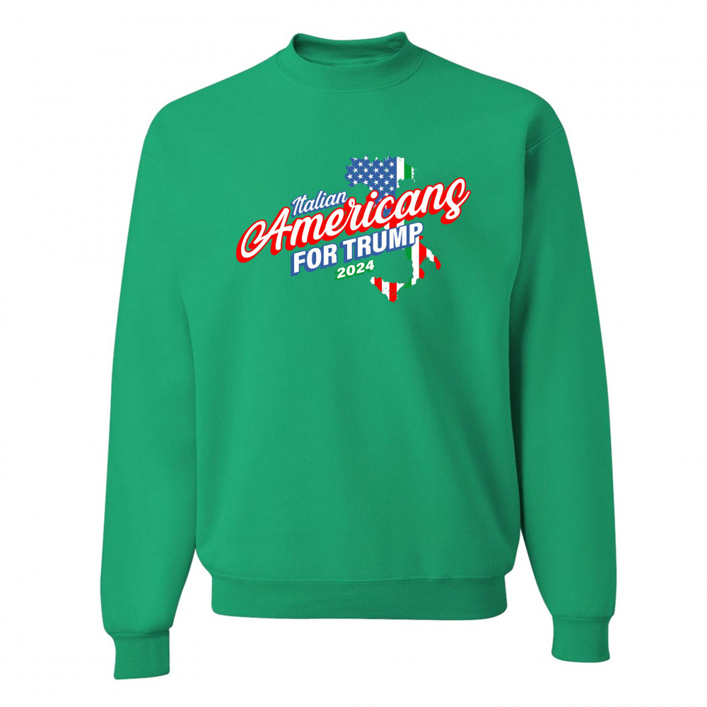 A political print saying "Italian Americans for Trump 2024". The print features a silhouette of Italy in the background with parts of the American and Italian flags inside of it. A great choice to wear for a Trump rally or give as a gift to a Donald Trump