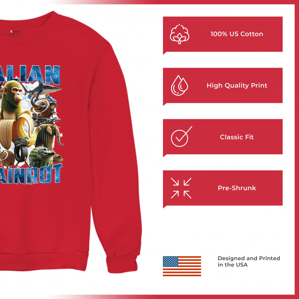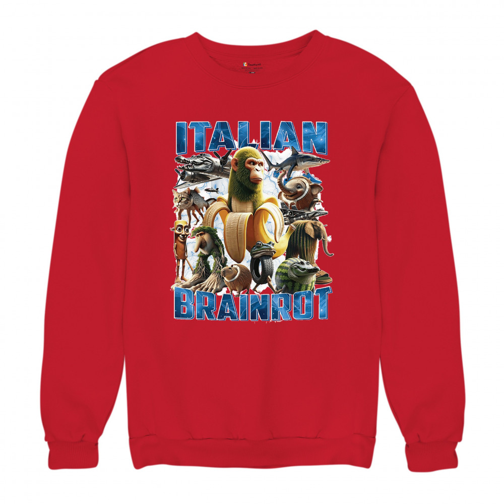 This design captures the full force of Italian brainrot—bananas, sharks, monkeys, and meme beasts collide in an unfiltered internet-core explosion. Perfect for fans of cursed humor, Gen Z trends, absurd fashion, TikTok memes, ironic style, surreal pop art, chaotic culture, digital nonsense, Gen Alpha brainrot, and hyper-online energy.