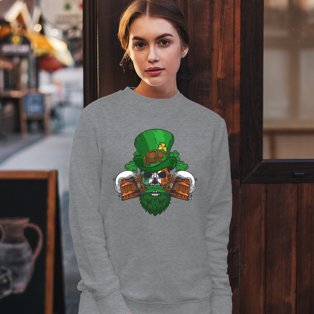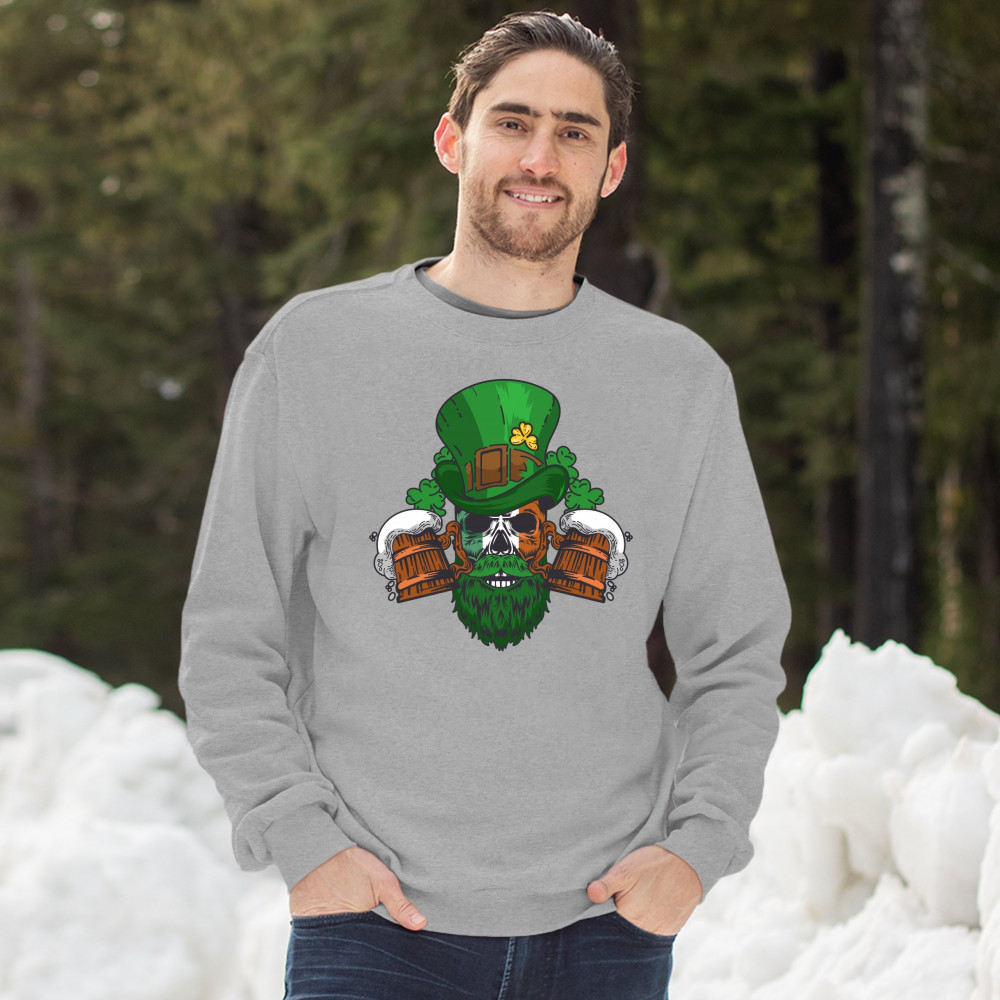 A print featuring a skull with green beard and Irish flag face. The skull is wearing a leprechaun hat. There are two beer mugs and numerous shamrocks around the skull. A great choice to wear on March 17 to celebrate the St. Patrick's Day and showcase your