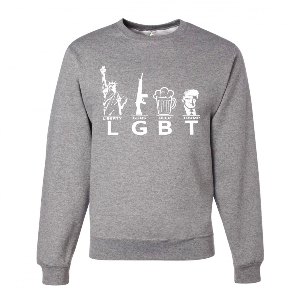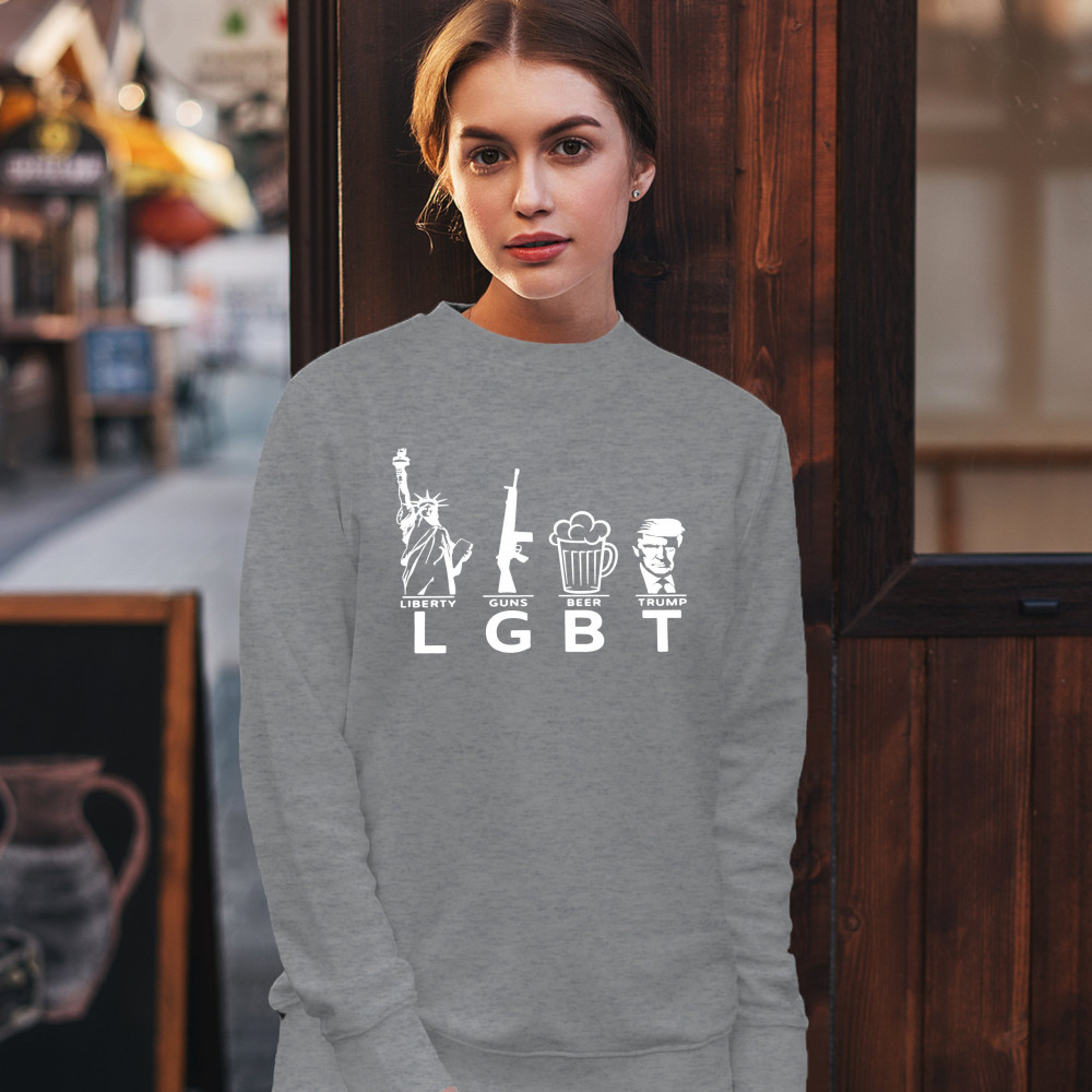 A funny political print featuring big letters LGBT, which stand for "Liberty, Guns, Beer and Trump". Above each word there are an underlined images of the Statue of Liberty, a rifle, a glass of beer and a picture of Donald Trump respectively. A great choi