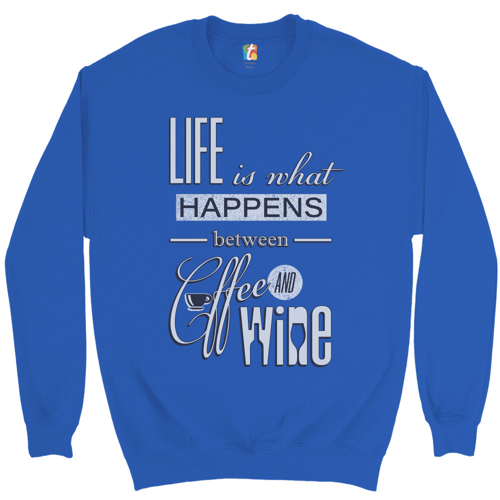 A print saying "Life is what happens between coffee and wine". Inside the letter "C" in "coffee" there is a cup and inside the word "wine" there are silhouettes of a bottle and a glass. Wear it to spread positive vibes and show your passion for the two best drinks in the universe!
