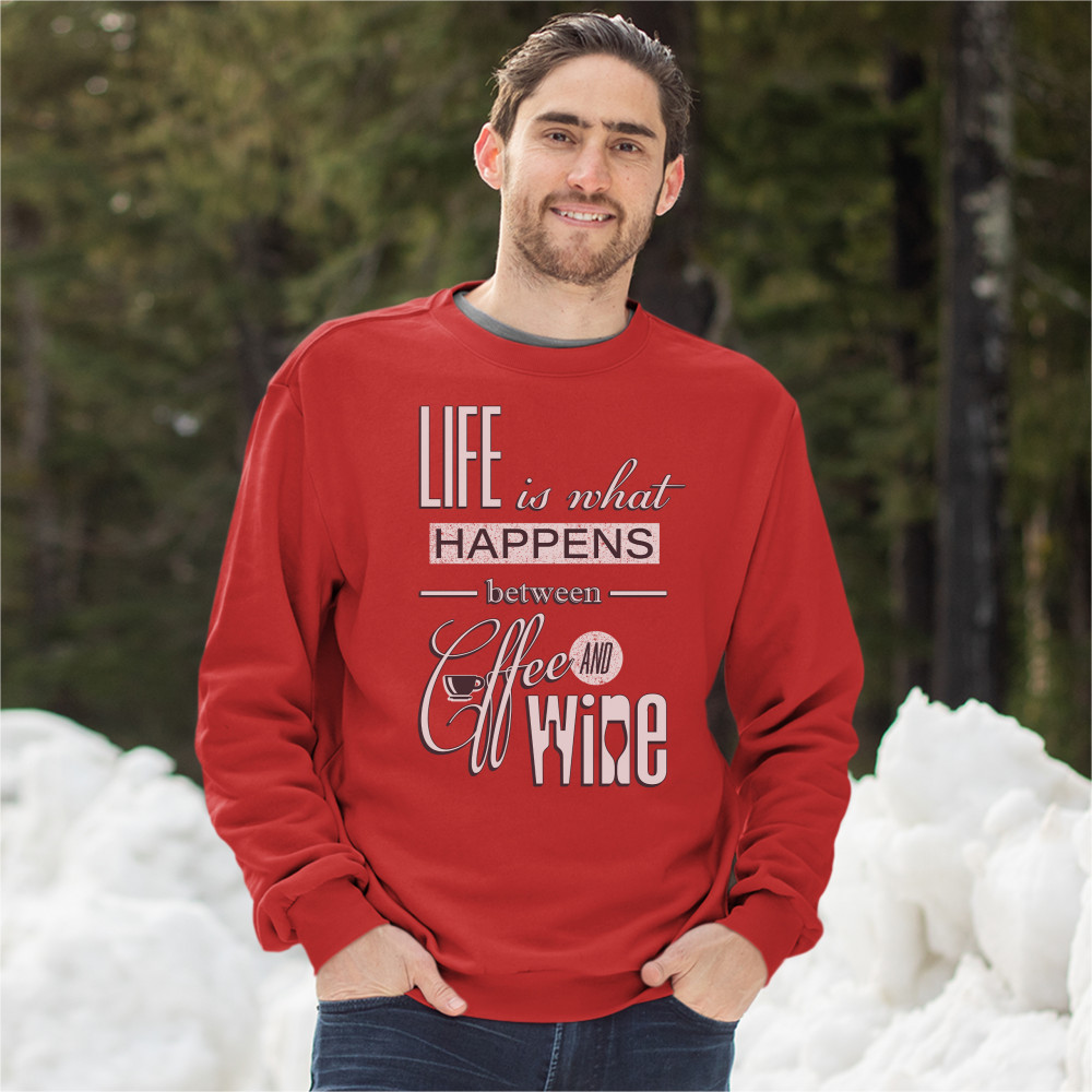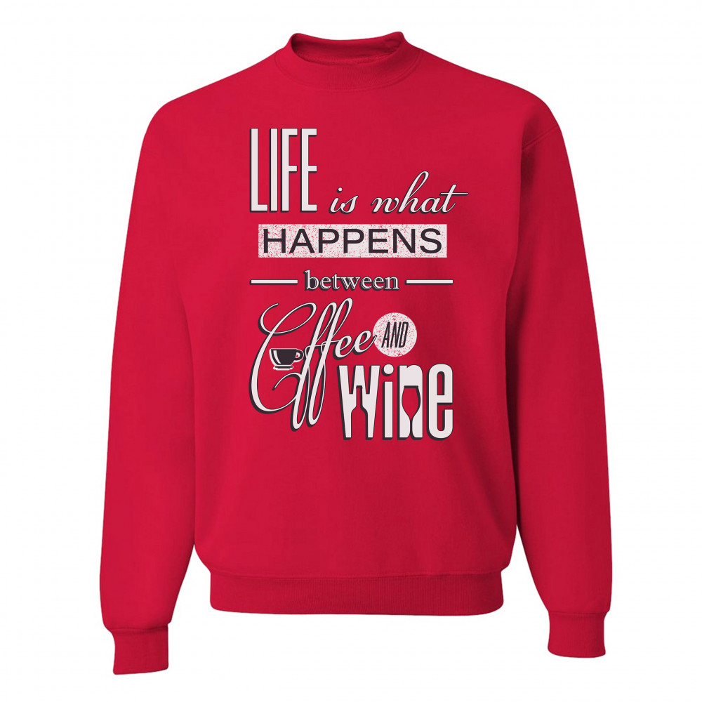 A print saying "Life is what happens between coffee and wine". Inside the letter "C" in "coffee" there is a cup and inside the word "wine" there are silhouettes of a bottle and a glass. Wear it to spread positive vibes and show your passion for the two best drinks in the universe!