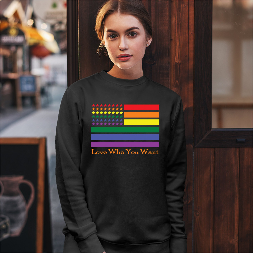 LOVE WHO YOU WANT sweatshirt american gay pride rainbow flag lgbt crewneck black
