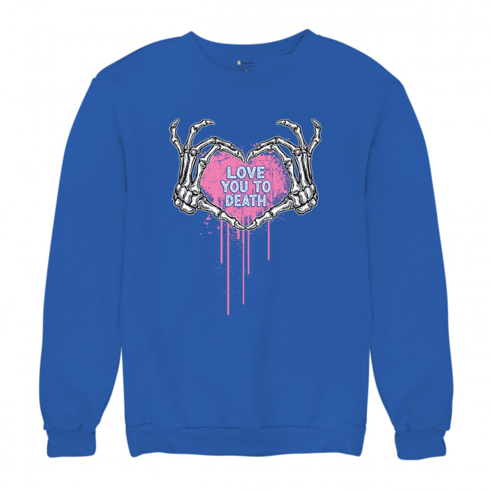 Show your spooky side with this skeleton hands heart design featuring a pink background and the phrase "Love You to Death." A perfect piece for alternative couples, Halloween lovers, and romantic rebels who embrace both affection and dark humor. Great for spooky season, date nights, and alt fashion outfits.