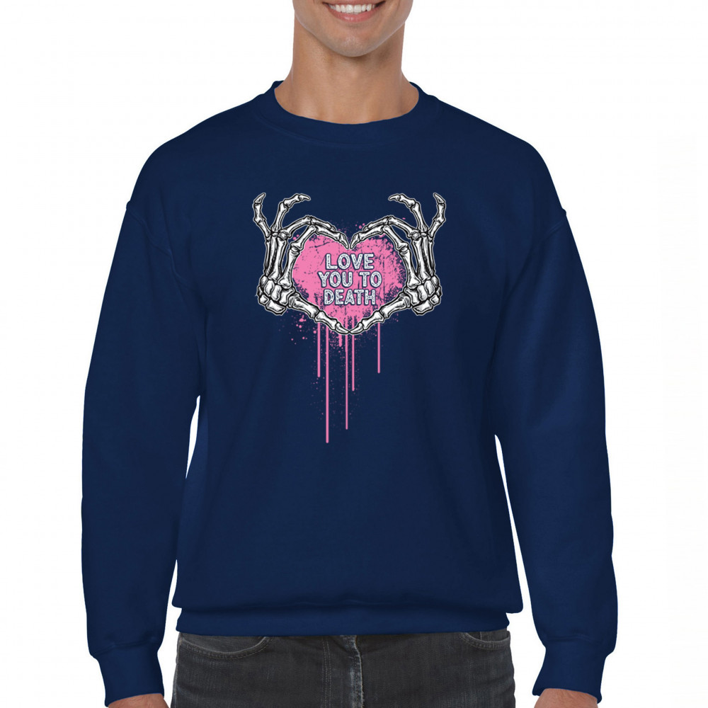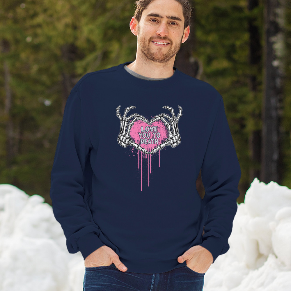 Show your spooky side with this skeleton hands heart design featuring a pink background and the phrase "Love You to Death." A perfect piece for alternative couples, Halloween lovers, and romantic rebels who embrace both affection and dark humor. Great for spooky season, date nights, and alt fashion outfits.
