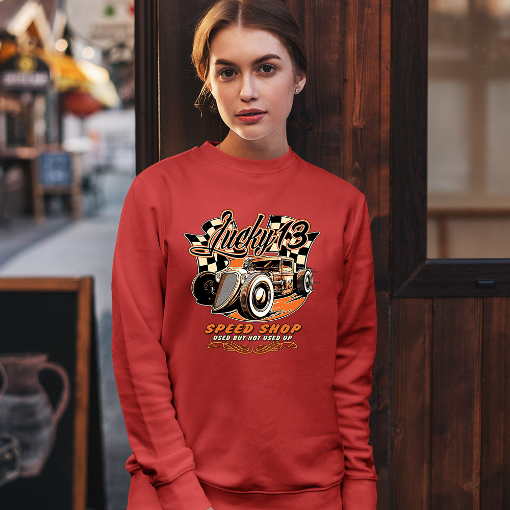 LUCKY 13 SPEED SHOP sweatshirt rat rod route 66 vintage racing car crewneck red