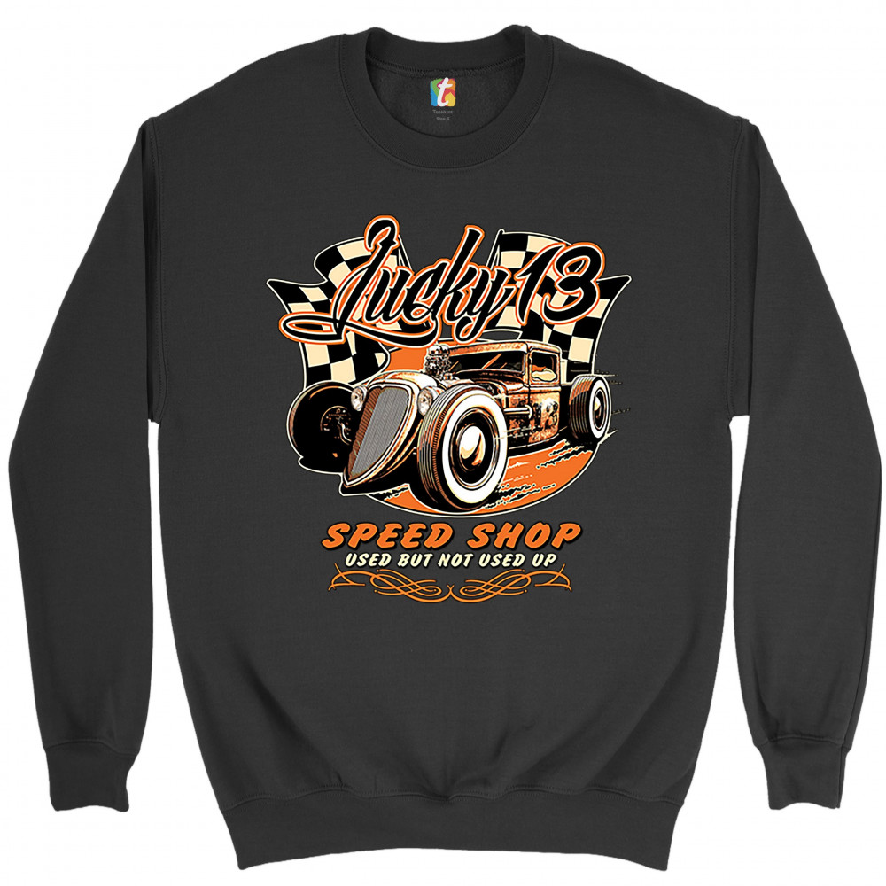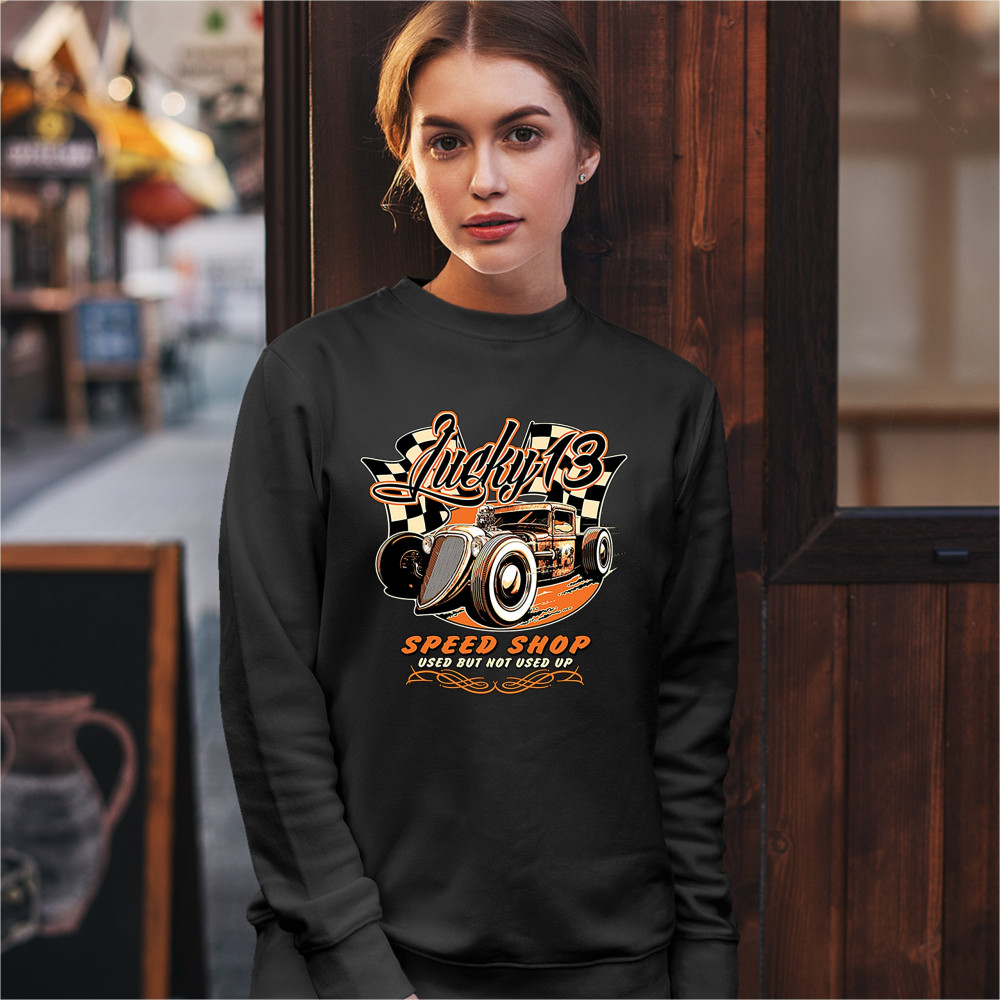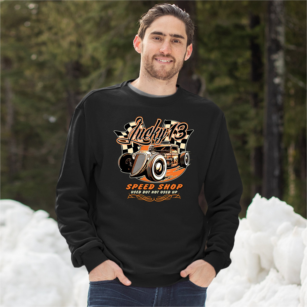 LUCKY 13 SPEED SHOP sweatshirt rat rod route 66 vintage racing car crewneck black