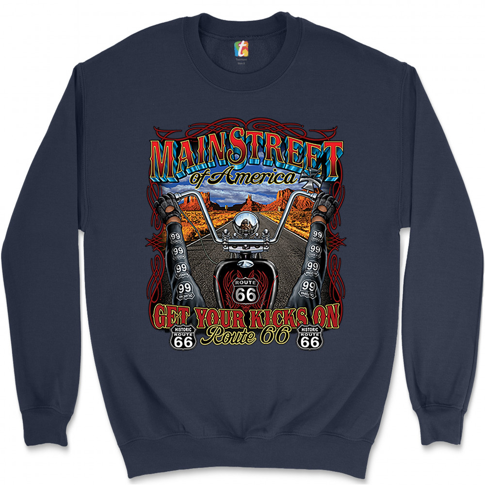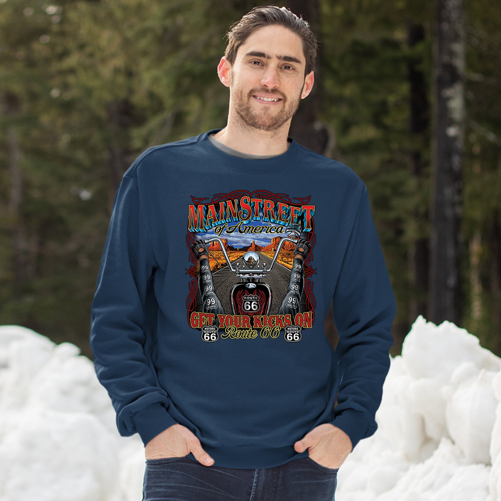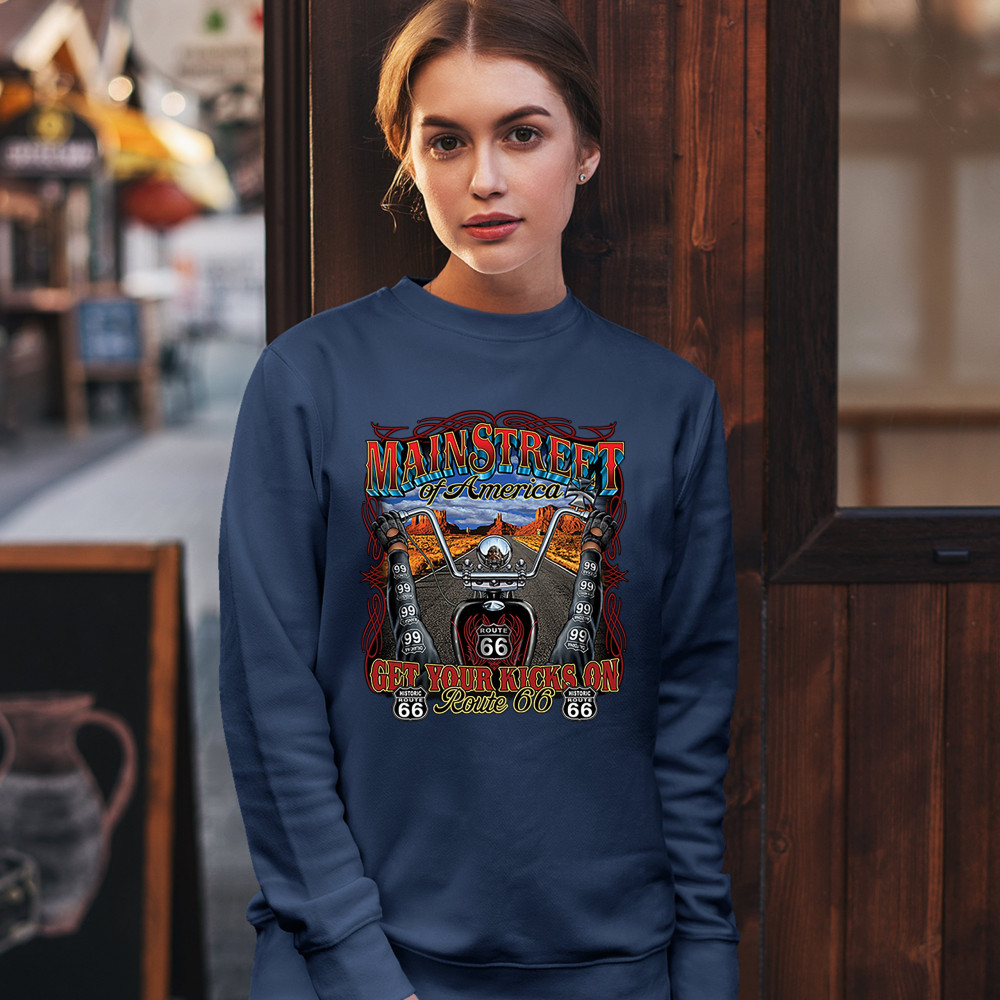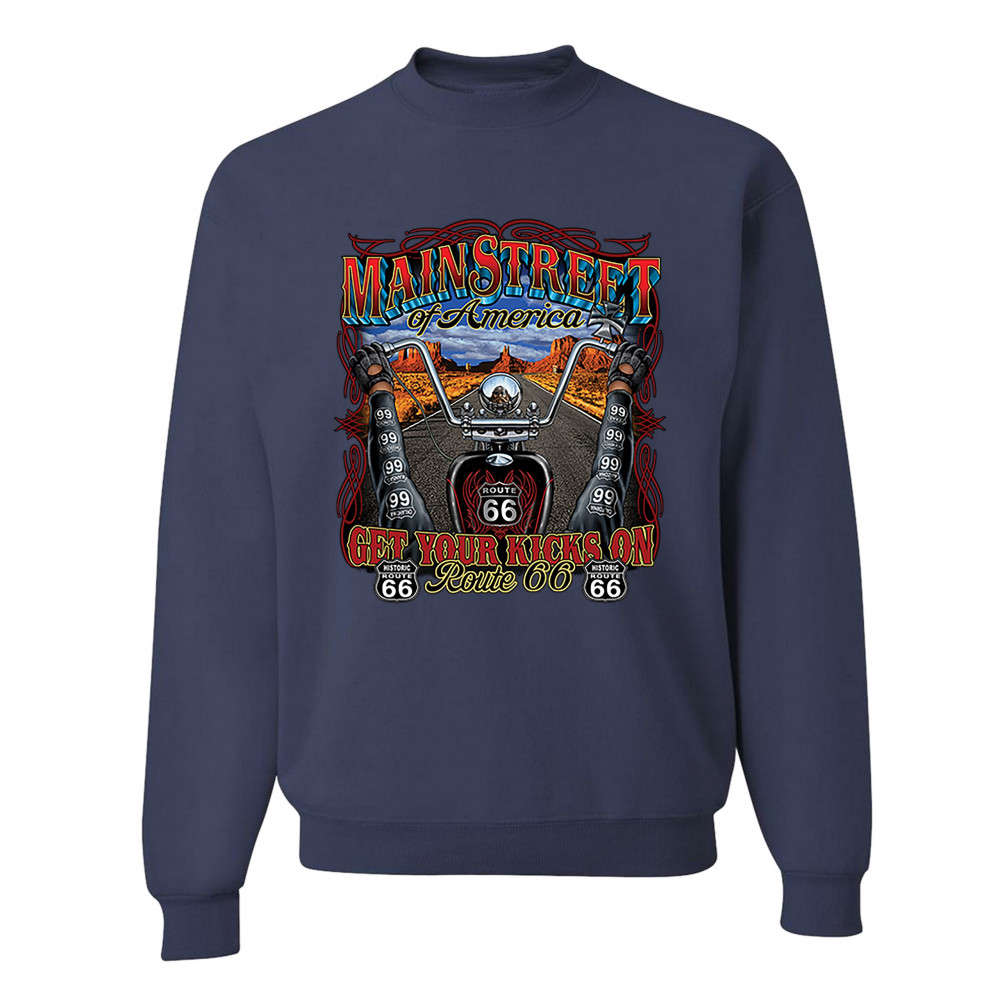 MAIN STREET OF AMERICA sweatshirt get your kicks on route 66 biker crewneck navy blue