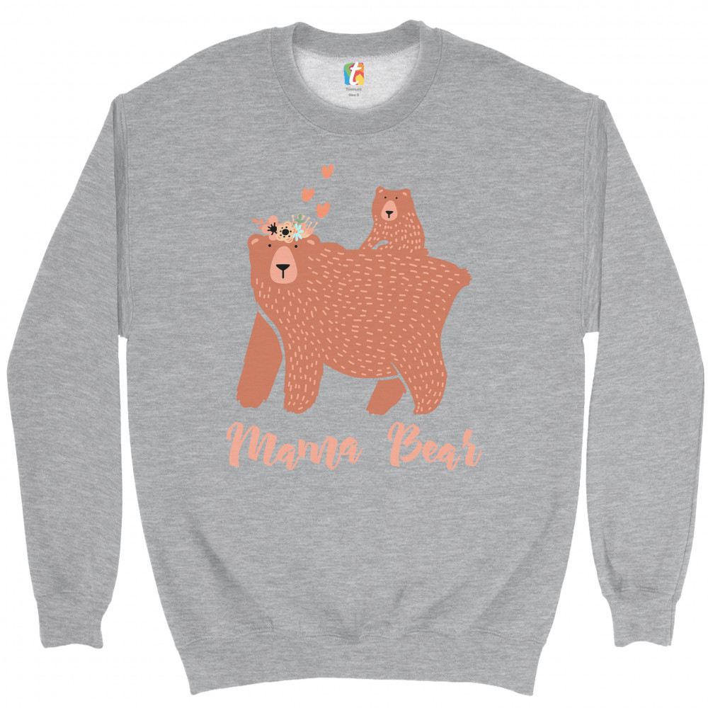 A beautiful print featuring a sweet momma bear caring a cub on her back. She is wearing a crown of flowers on her head with several hearts floating above it. Underneath her it says: "Mama Bear". A great choice as a gift on Mother's Day for a loving caring mom.