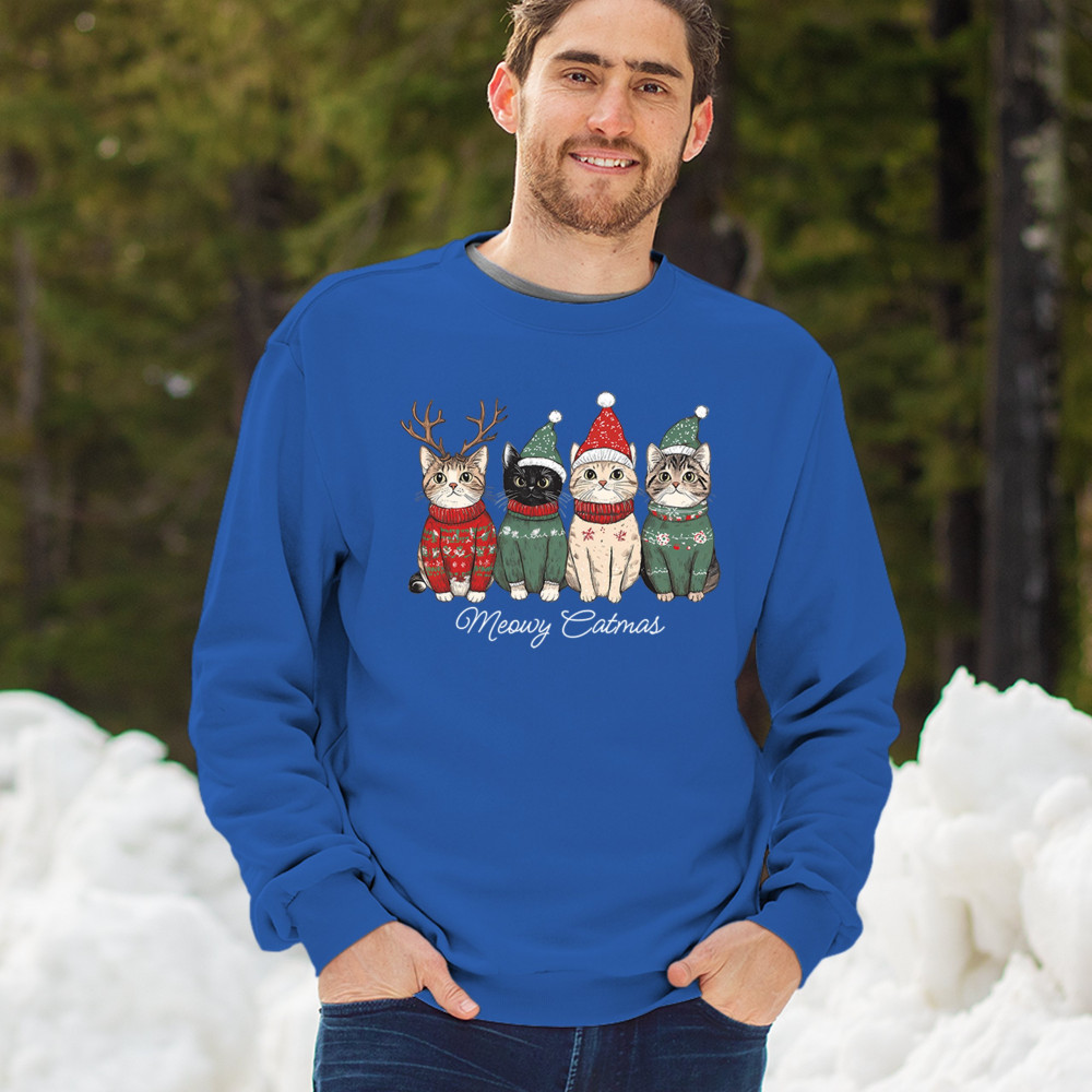 Cute Meowy Catmas design with festive kittens, perfect for cat lovers wanting a cozy holiday graphic and fun Christmas pet theme.