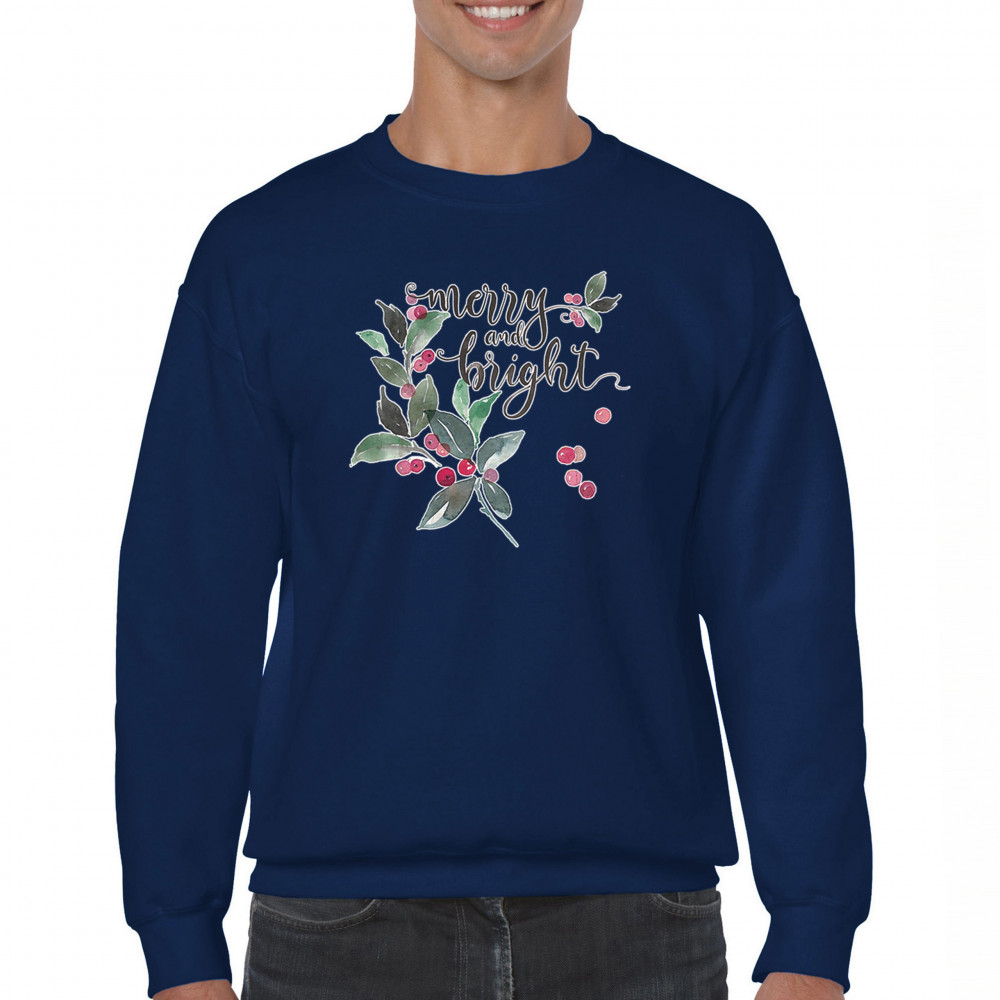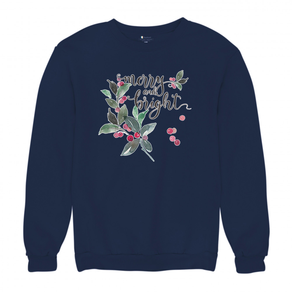 MERRY AND BRIGHT CUTE CHRISTMAS sweatshirt jolly santa clause xmas crewneck navy blue