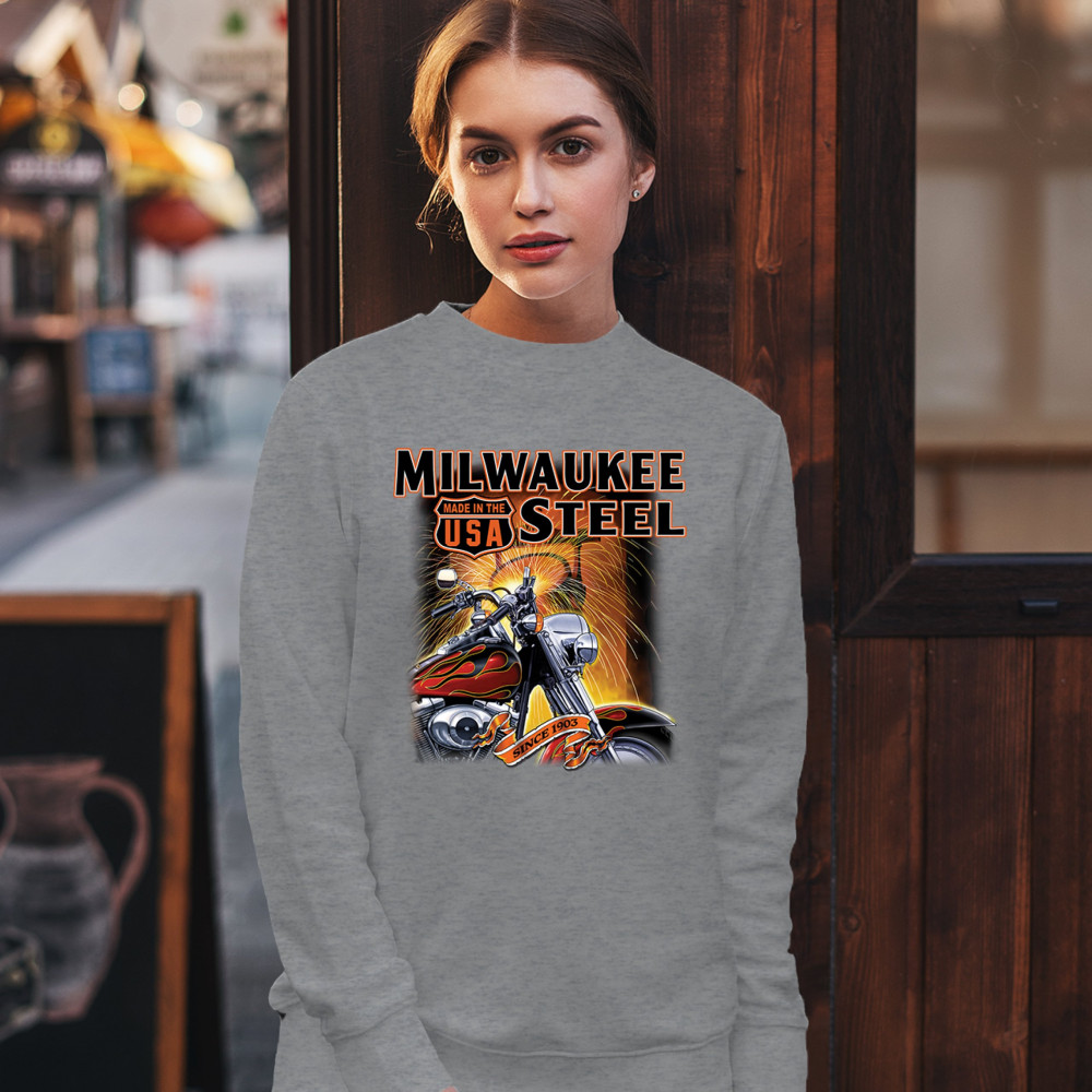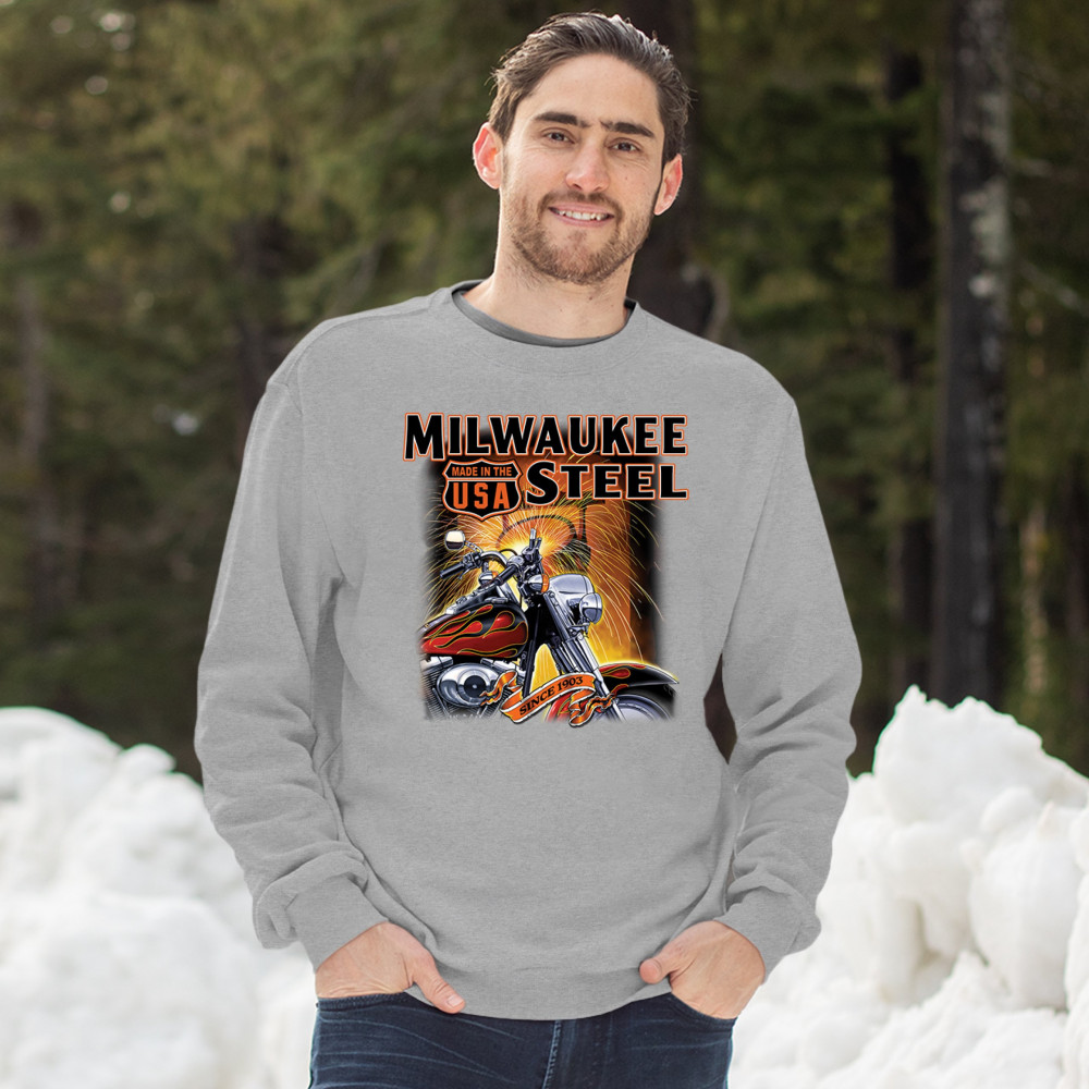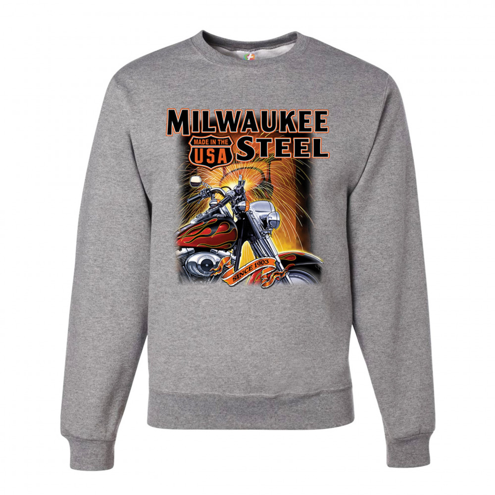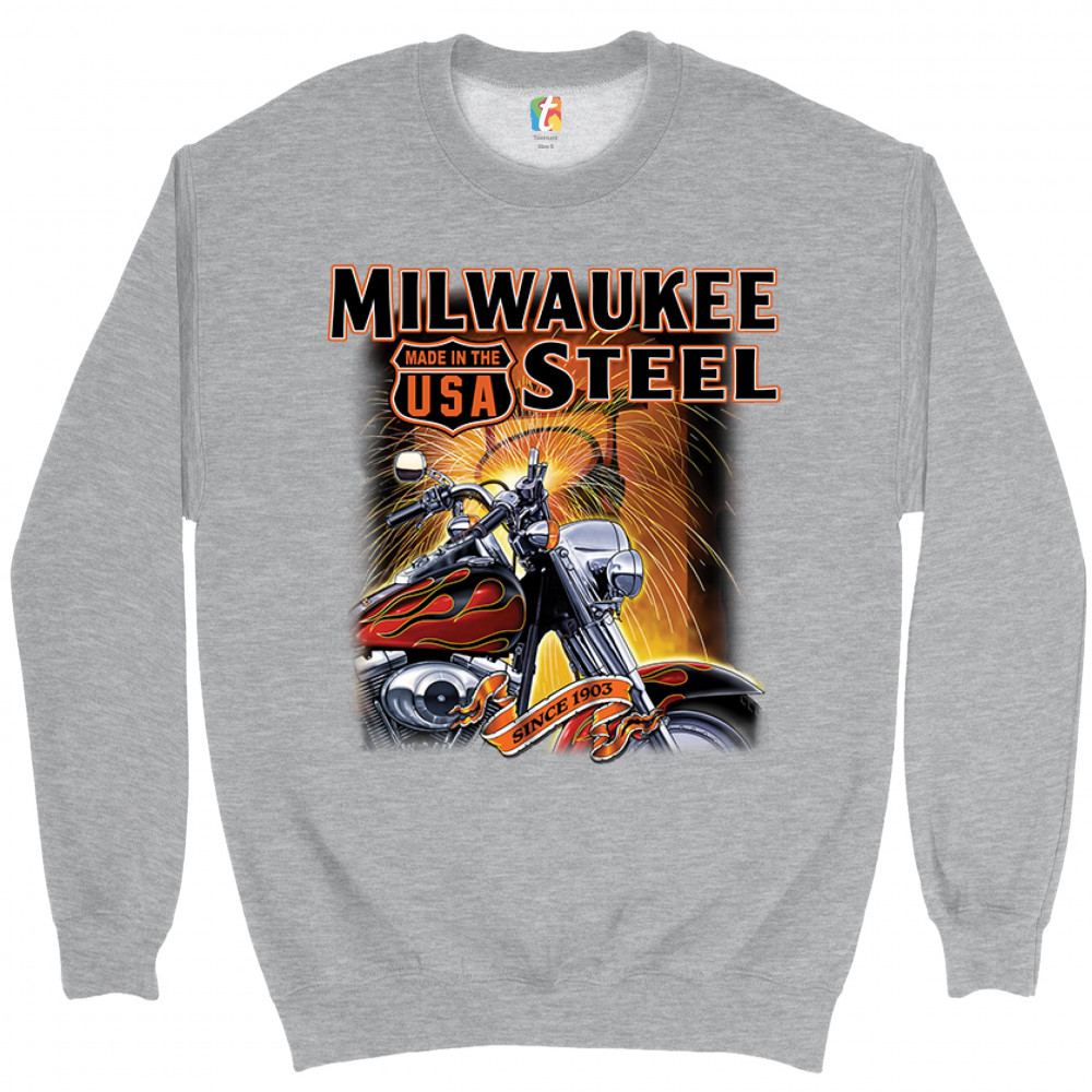 A print featuring a motorcycle in the front and a melting furnace in the background with sparkles flying all over the place. The print says: "Milwaukee Steel". There is also a sign that says "made in the USA" and a stripe with "since 1903" written on it.