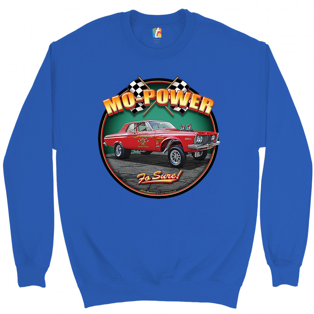 MO-POWER FO SURE! sweatshirt american muscle car racing route 66 crewneck royal blue