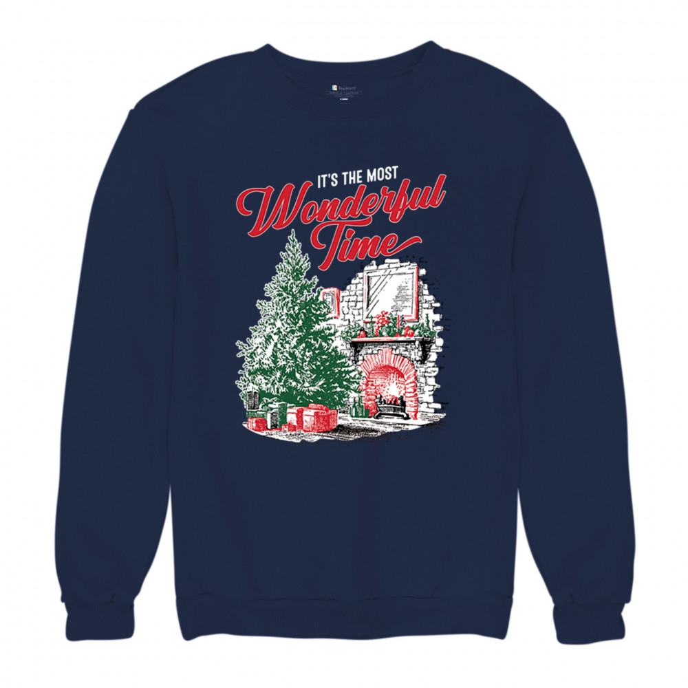 Make your holidays brighter with this “Most Wonderful Time” Christmas design, featuring a glowing fireplace, festive living room, and decorated Christmas tree. This cozy Christmas shirt combines holiday home decor style with classic Merry Xmas charm. Perfect for those who love Santa Claus, Rudolph, reindeer, Let It Snow vibes, and cheerful holiday fashion.