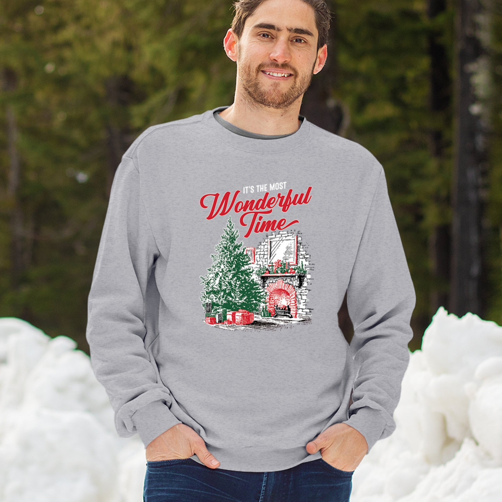 Most Wonderful Time Christmas shirt – cozy holiday design with fireplace scene, Christmas tree, Santa Claus, Rudolph, and festive living room charm.