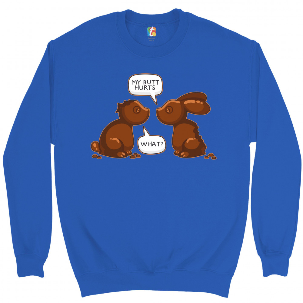 MY BUTT HURTS - WHAT? sweatshirt chocolate bunnies easter rabbits crewneck royal blue