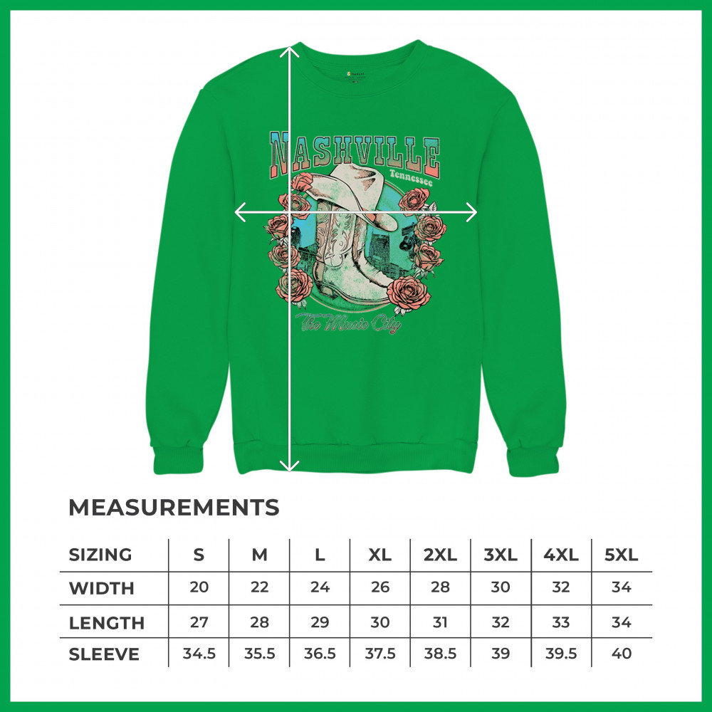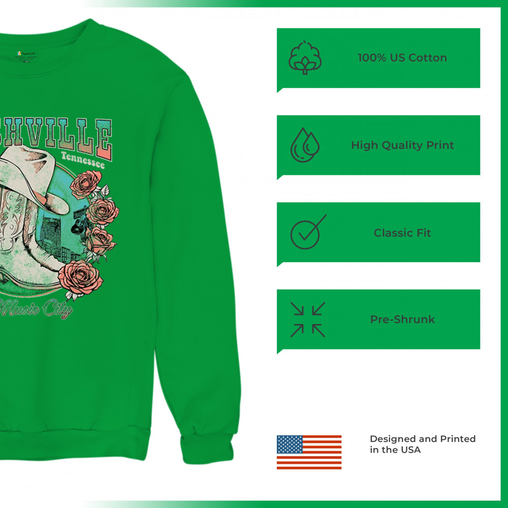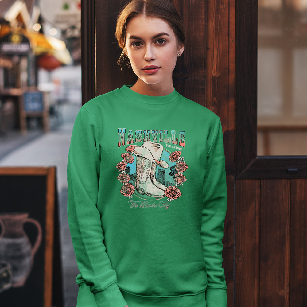 NASHVILLE TN THE MUSIC CITY crewneck sweatshirt country cowgirl boots and hat green