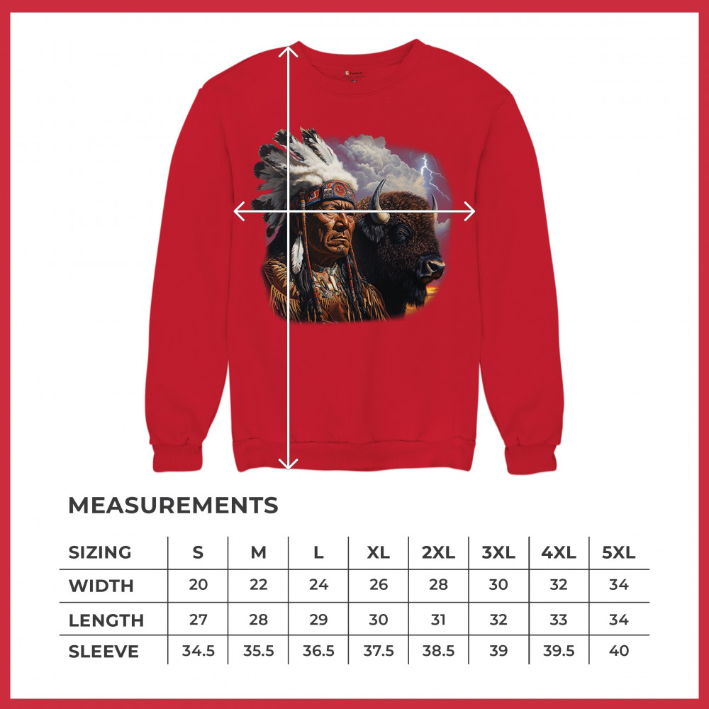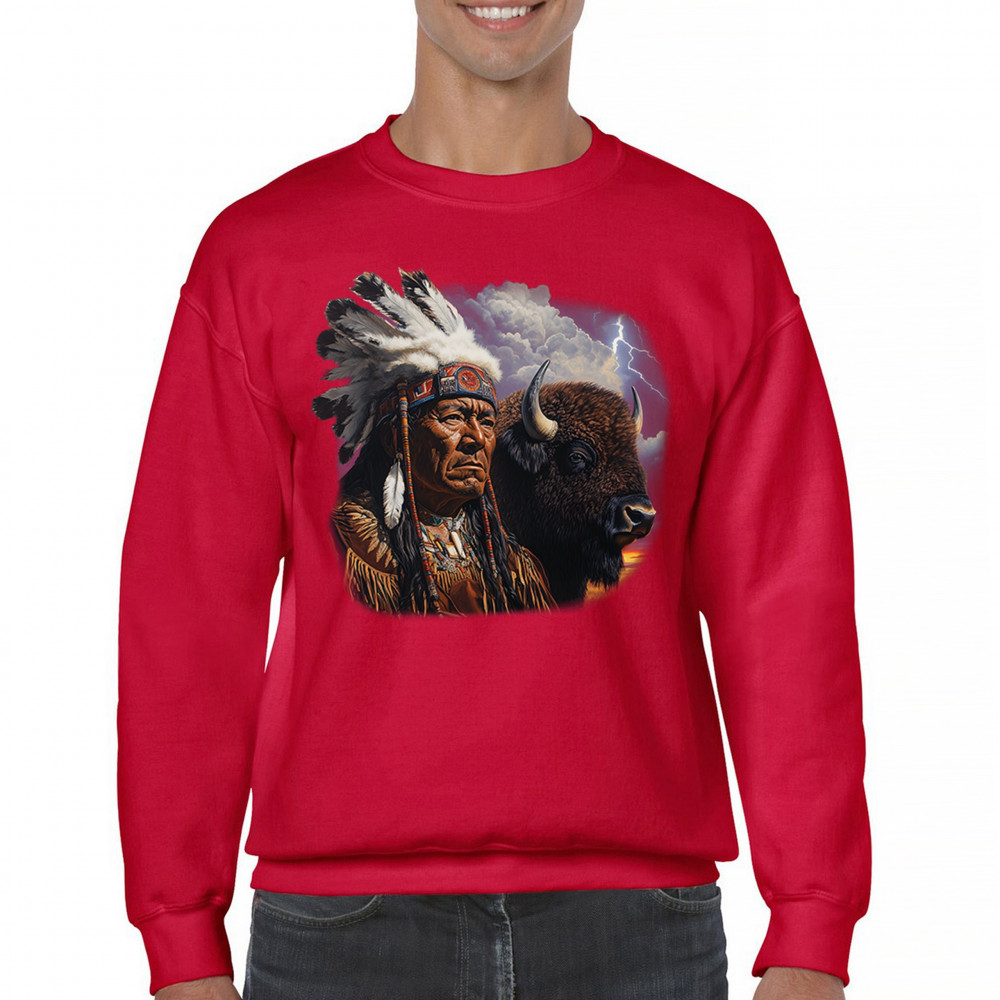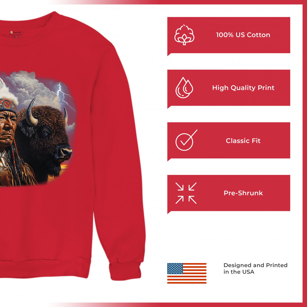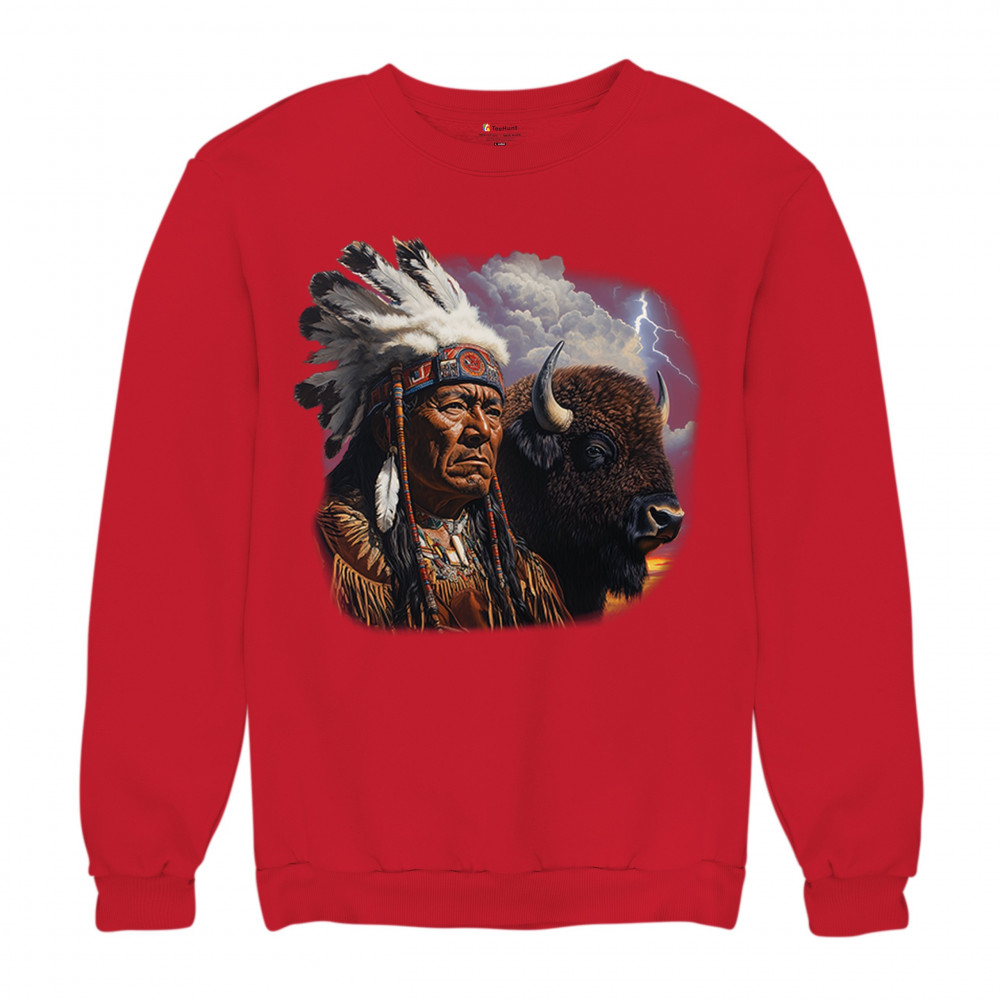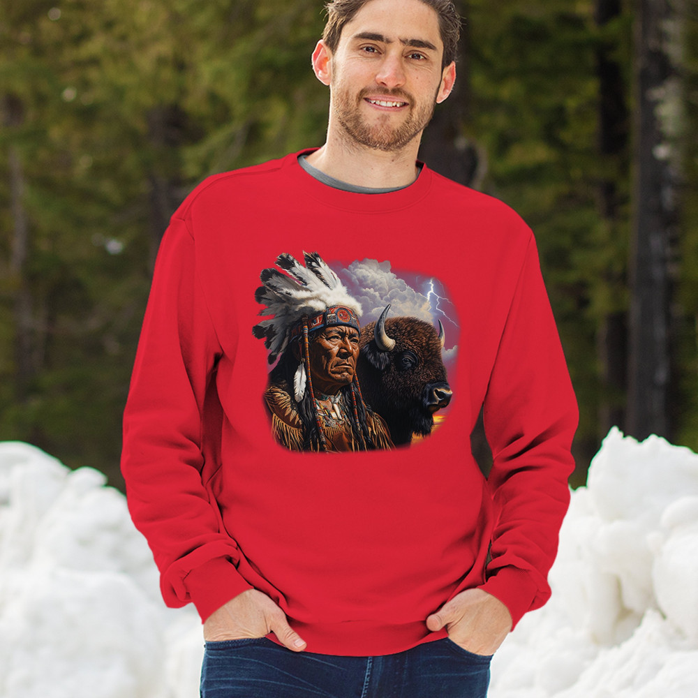 This powerful design features a Native American elder in traditional dress and feathered headdress beside a noble bison. Framed by a stormy sky and lightning, the art symbolizes tribal pride, spiritual harmony, ancestral strength, and a deep connection to nature’s raw energy.