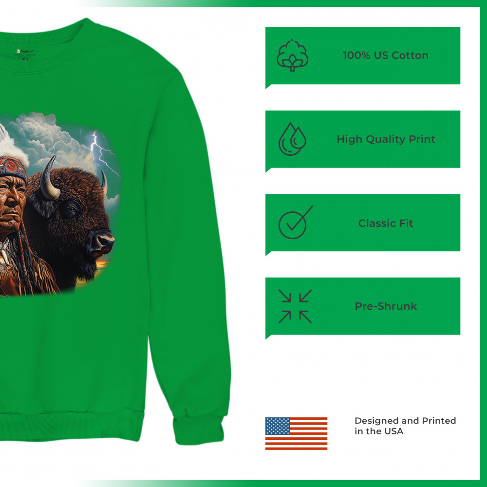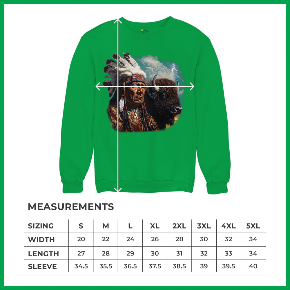 This powerful design features a Native American elder in traditional dress and feathered headdress beside a noble bison. Framed by a stormy sky and lightning, the art symbolizes tribal pride, spiritual harmony, ancestral strength, and a deep connection to nature’s raw energy.