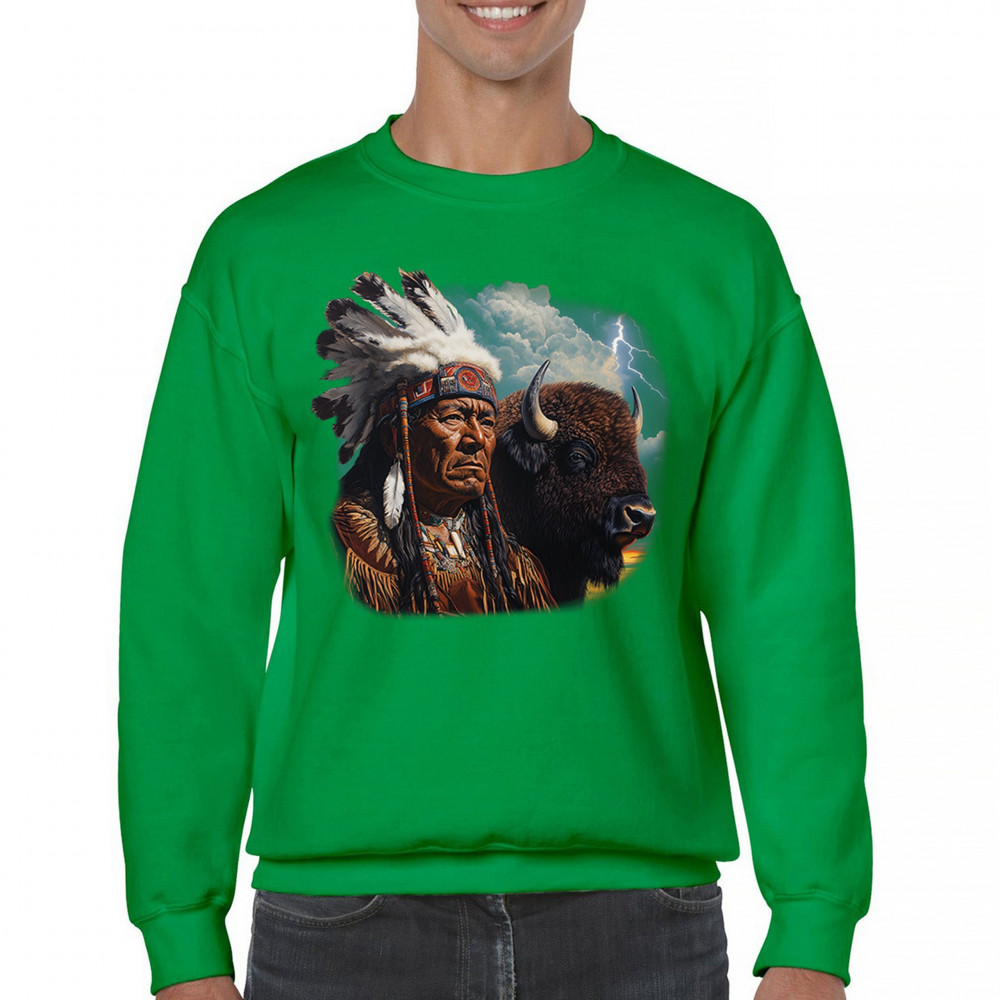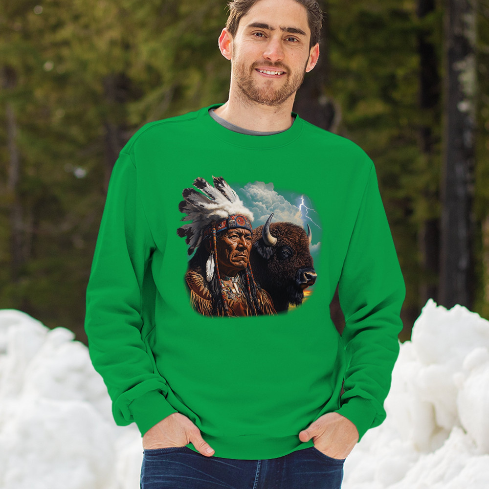 Bold tribal elder and bison design framed by lightning sky—honoring heritage, strength, resilience, and sacred connection to nature.