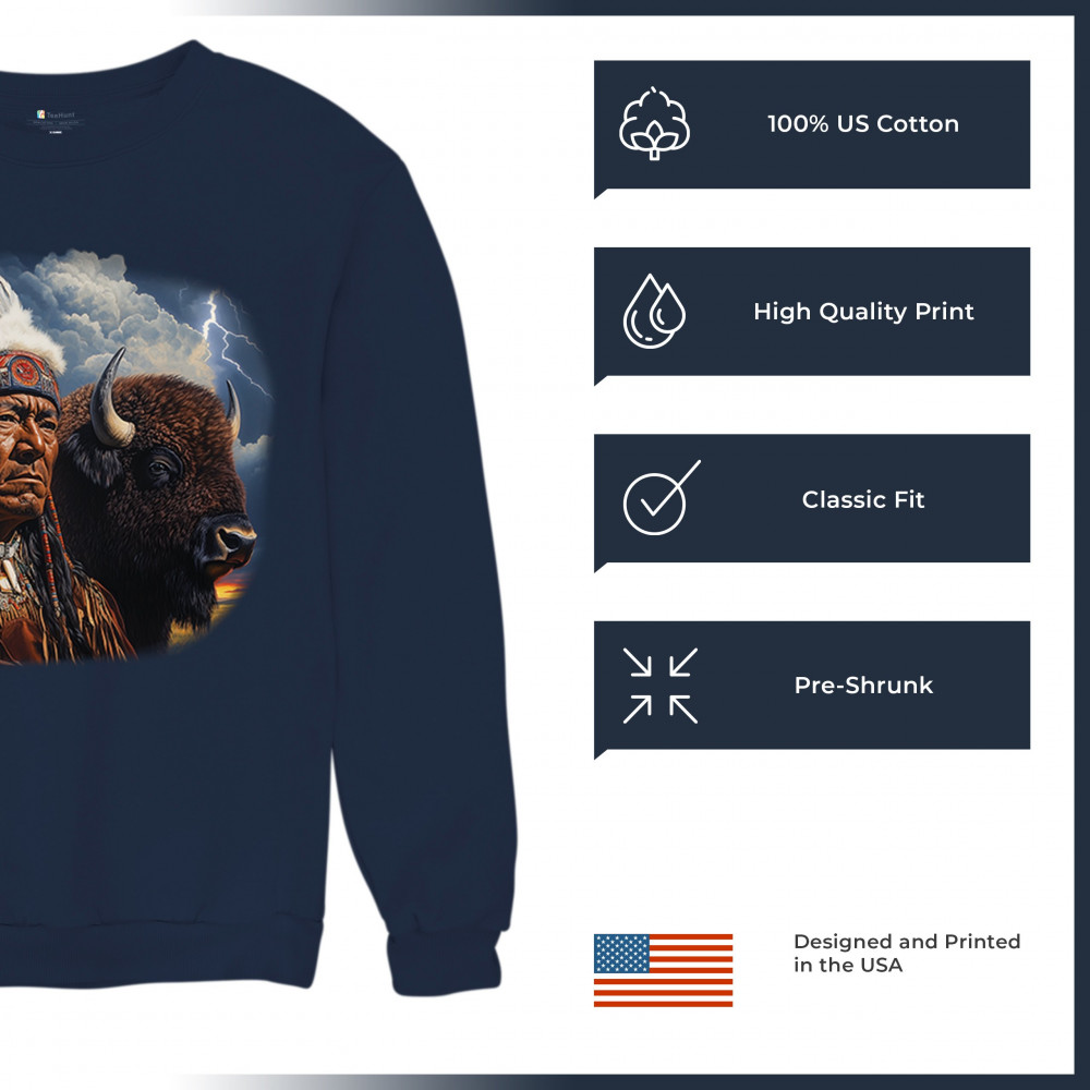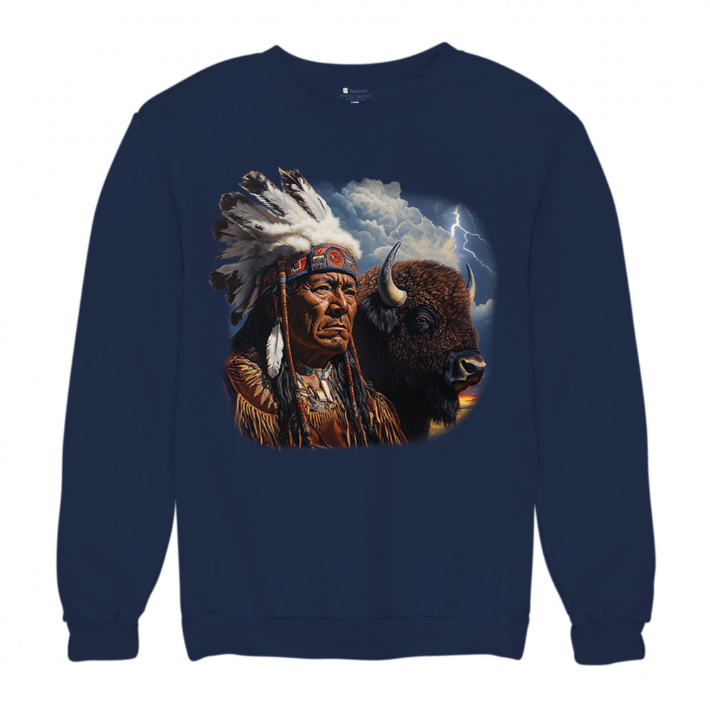 Bold tribal elder and bison design framed by lightning sky—honoring heritage, strength, resilience, and sacred connection to nature.