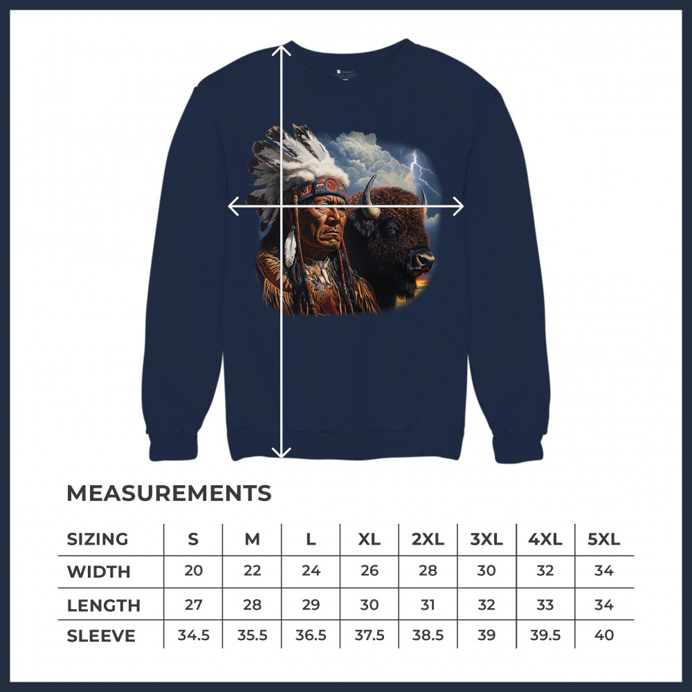This powerful design features a Native American elder in traditional dress and feathered headdress beside a noble bison. Framed by a stormy sky and lightning, the art symbolizes tribal pride, spiritual harmony, ancestral strength, and a deep connection to nature’s raw energy.