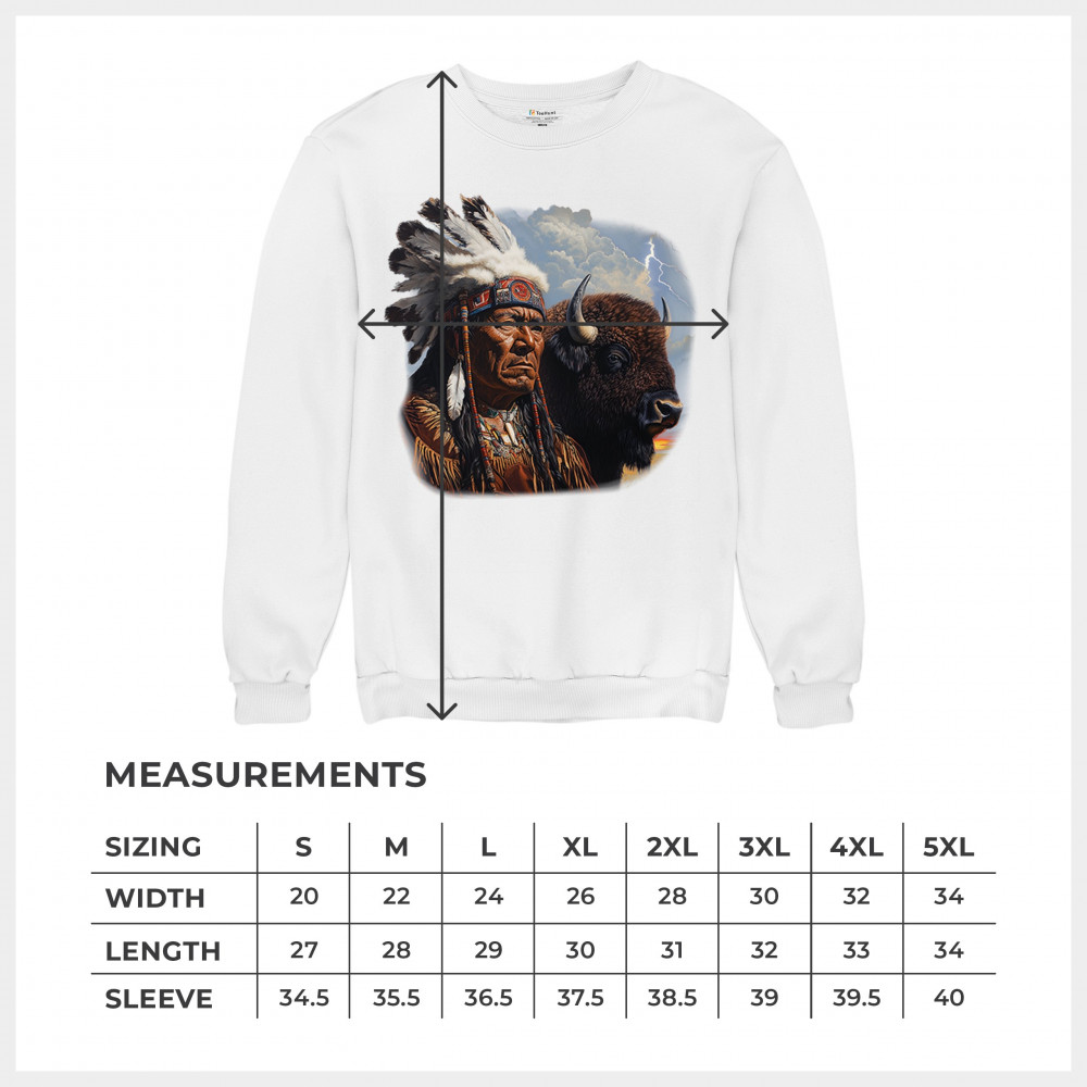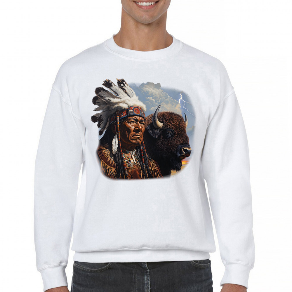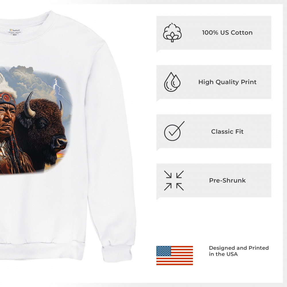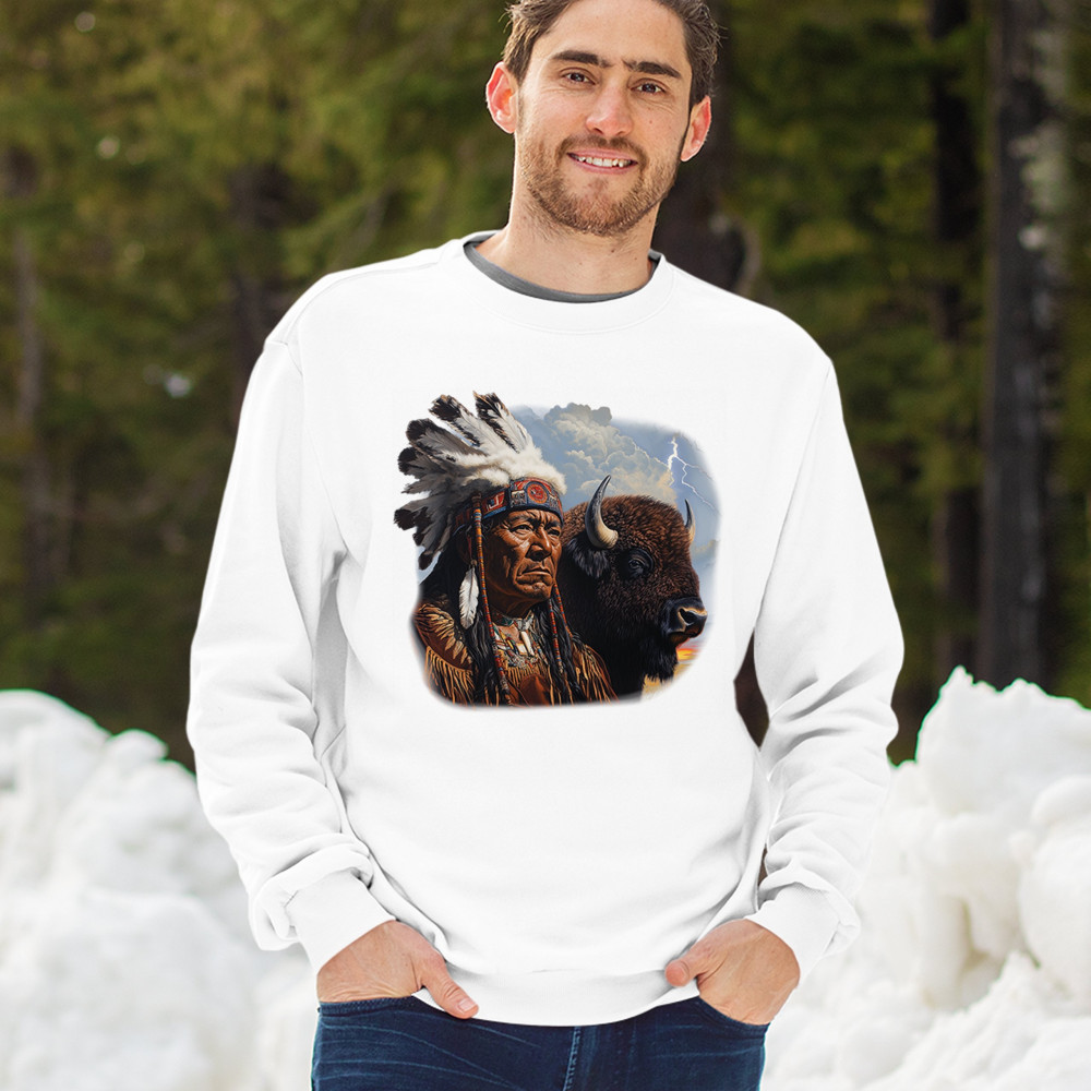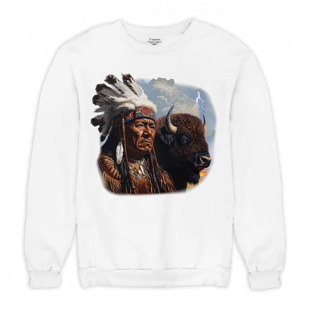 This powerful design features a Native American elder in traditional dress and feathered headdress beside a noble bison. Framed by a stormy sky and lightning, the art symbolizes tribal pride, spiritual harmony, ancestral strength, and a deep connection to nature’s raw energy.