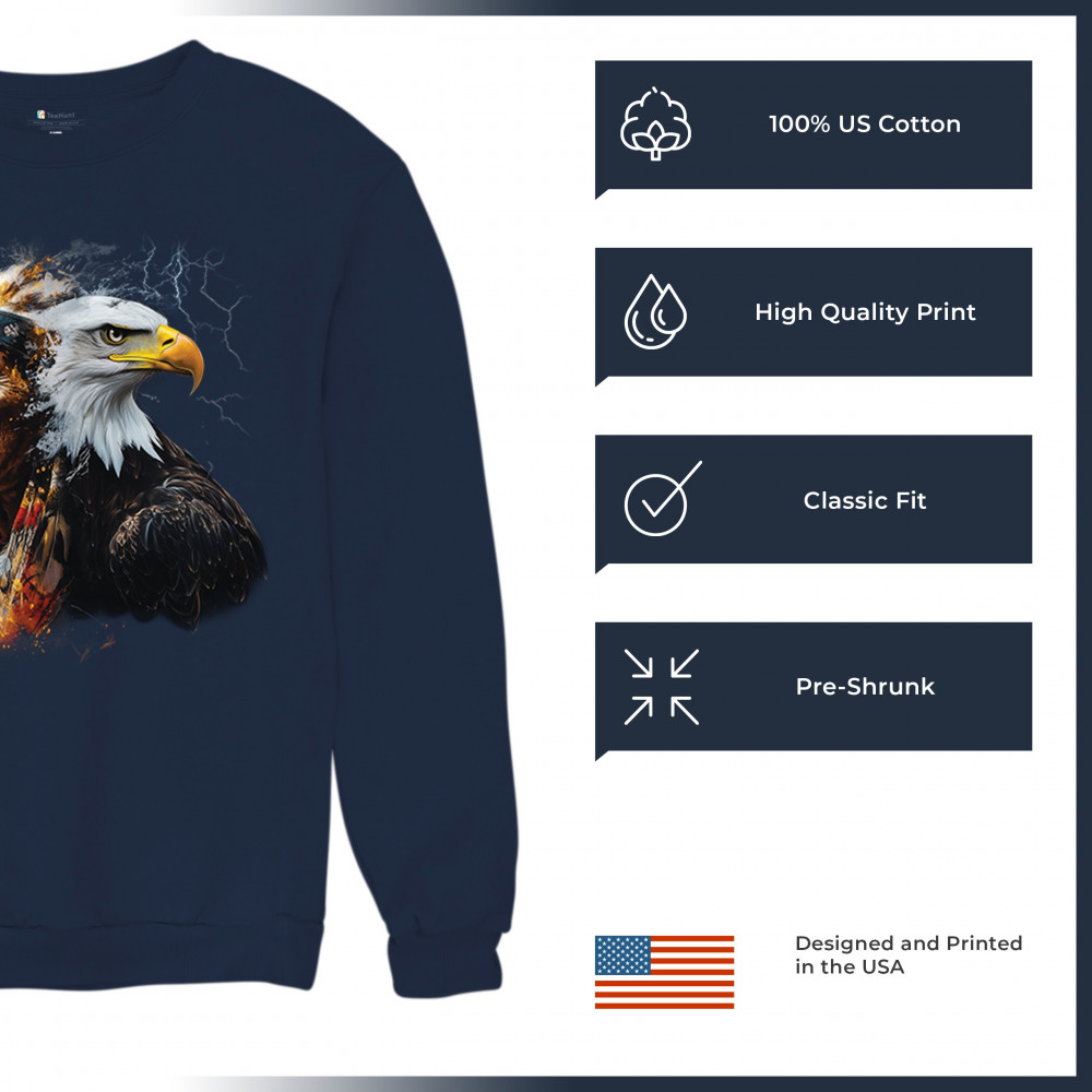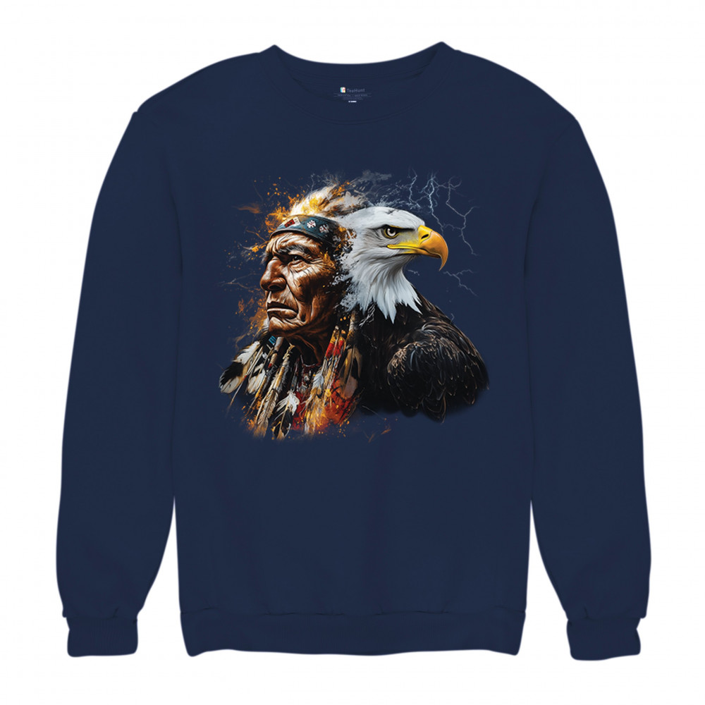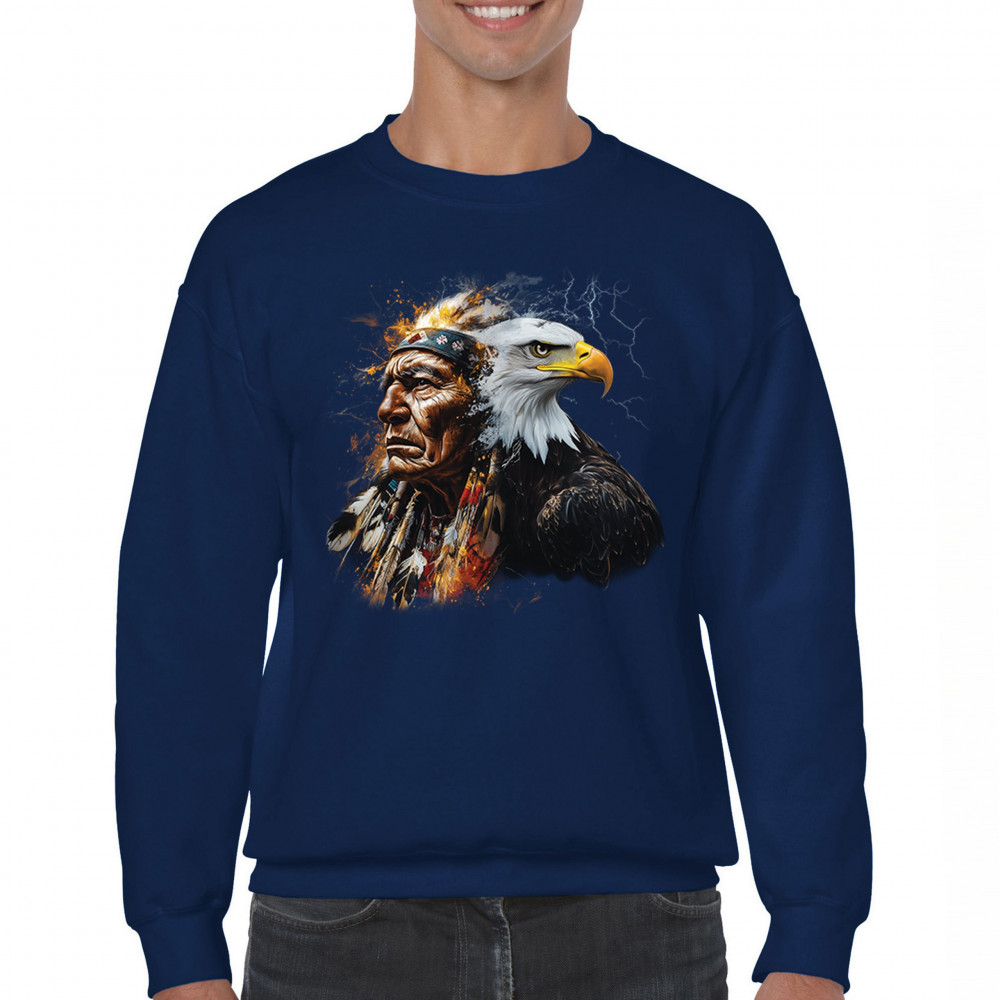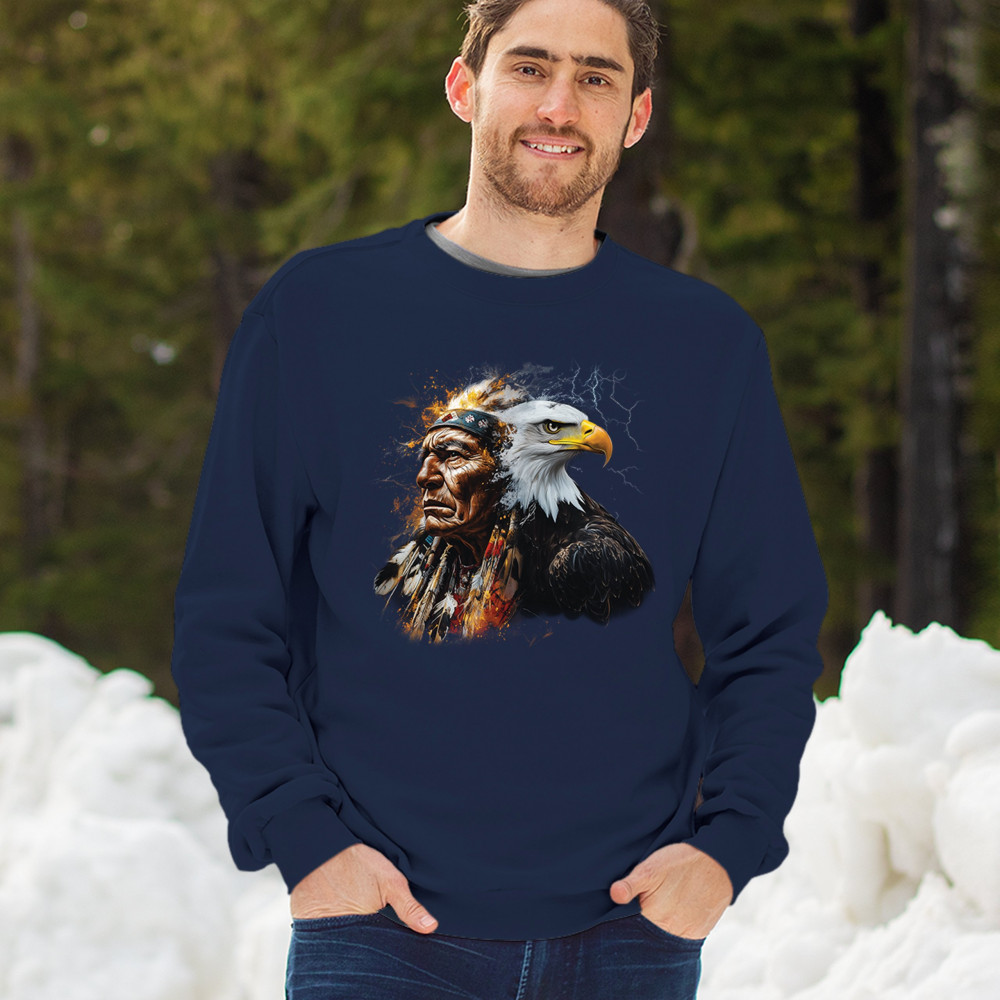 This electrifying design showcases a Native American chief with a bold bald eagle, surrounded by lightning and fire. It blends spiritual animal symbolism with cultural strength and pride. Ideal for admirers of tribal heritage, ancestral energy, and fierce visual storytelling through nature and tradition.
