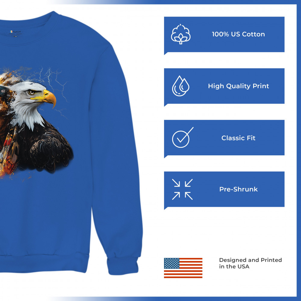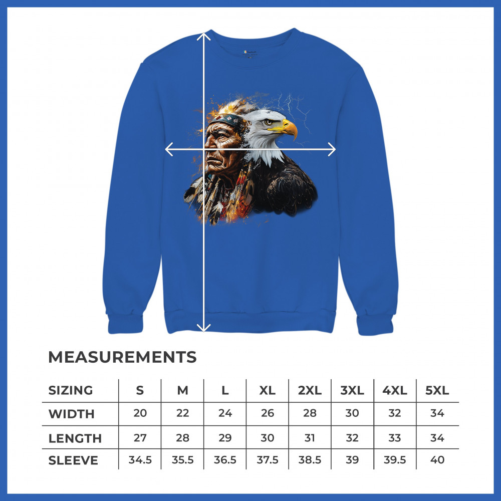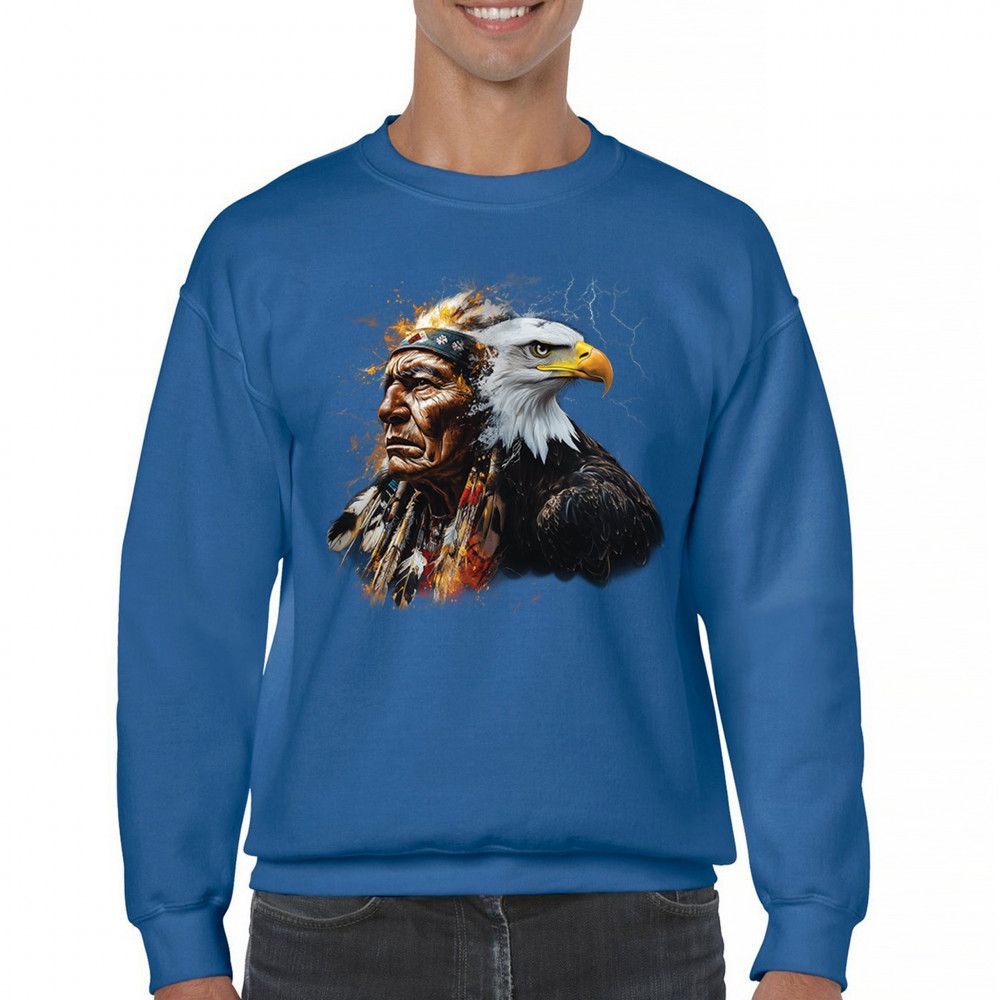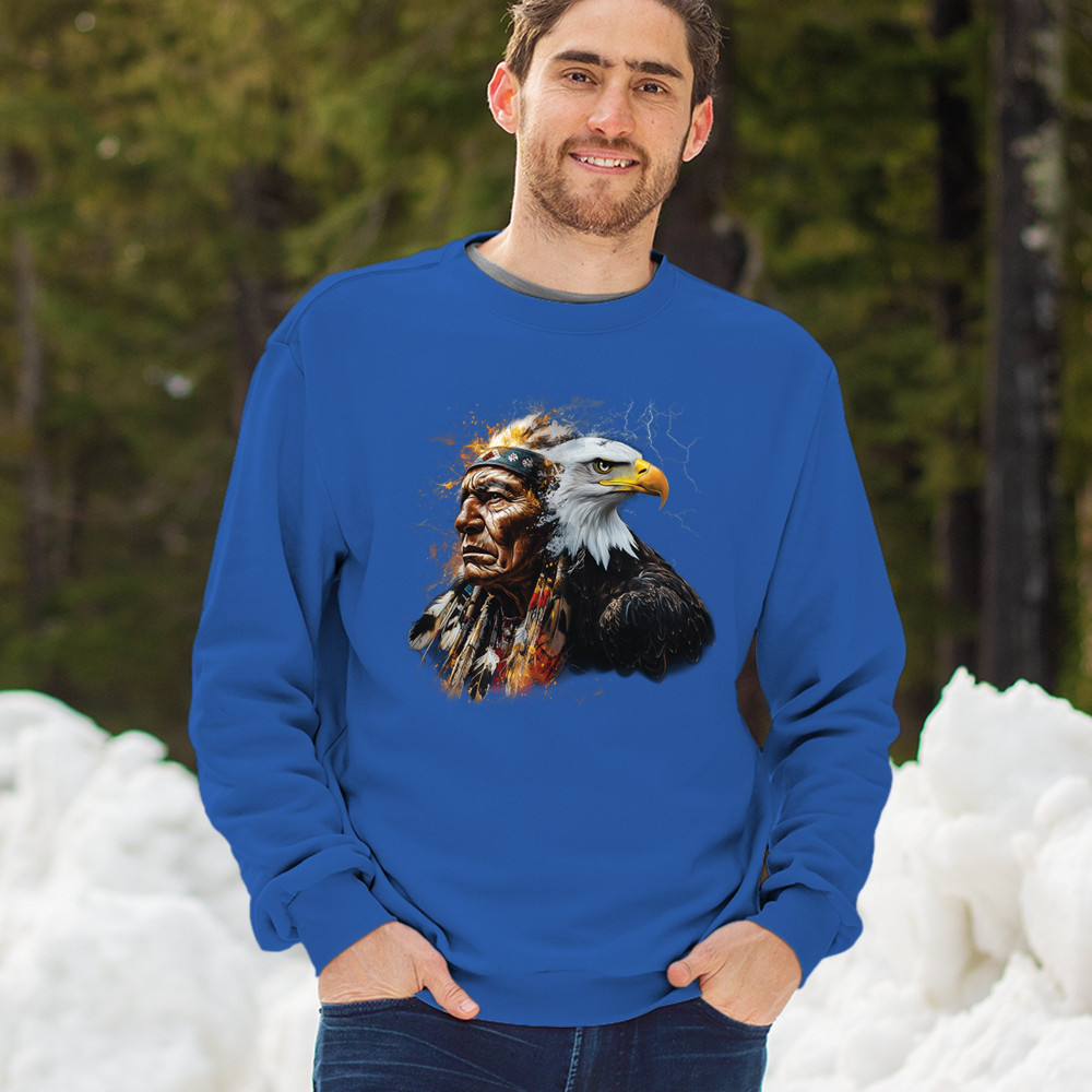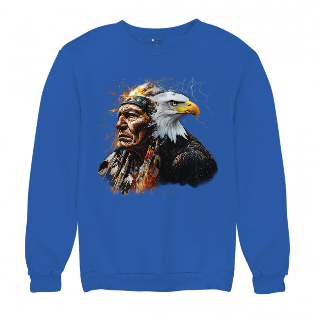This electrifying design showcases a Native American chief with a bold bald eagle, surrounded by lightning and fire. It blends spiritual animal symbolism with cultural strength and pride. Ideal for admirers of tribal heritage, ancestral energy, and fierce visual storytelling through nature and tradition.