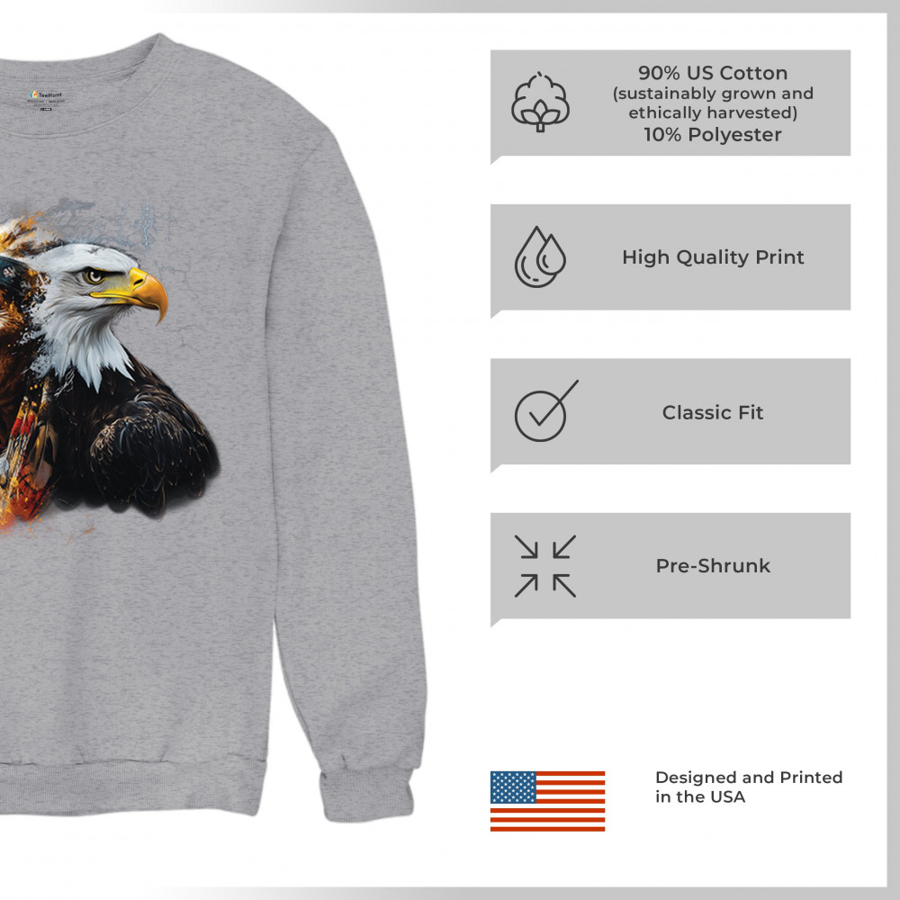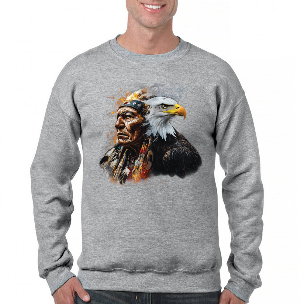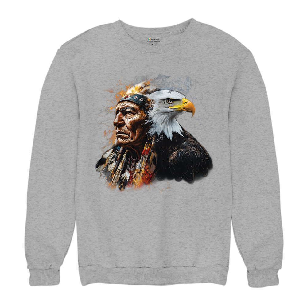 This electrifying design showcases a Native American chief with a bold bald eagle, surrounded by lightning and fire. It blends spiritual animal symbolism with cultural strength and pride. Ideal for admirers of tribal heritage, ancestral energy, and fierce visual storytelling through nature and tradition.