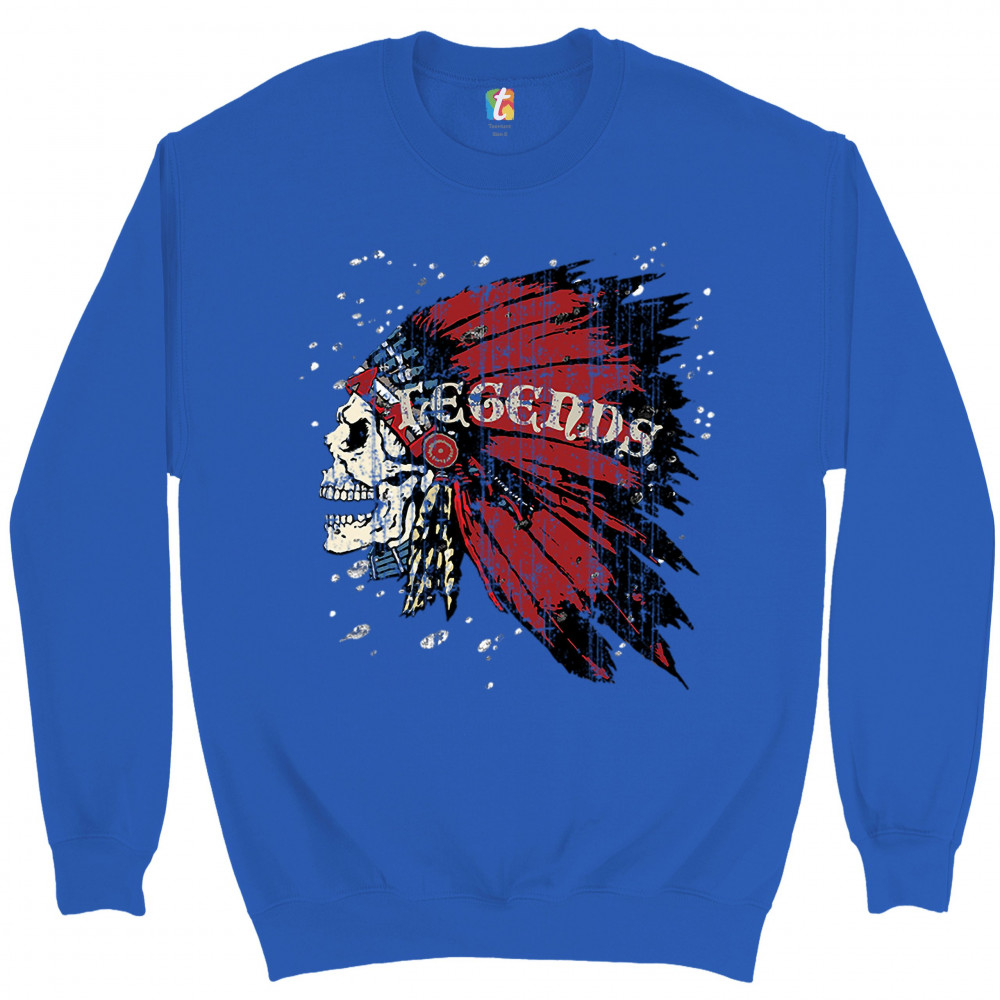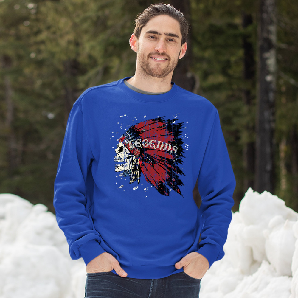 NATIVE AMERICAN LEGENDS sweatshirt skull face war bonnet headdress crewneck royal blue