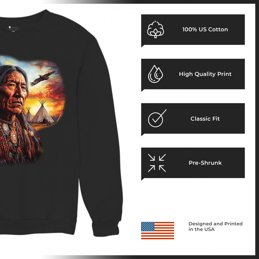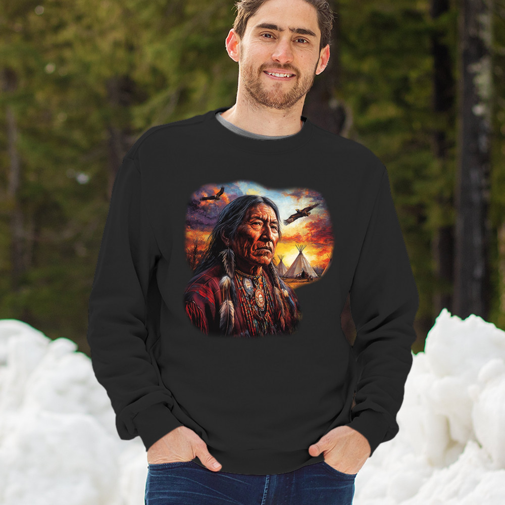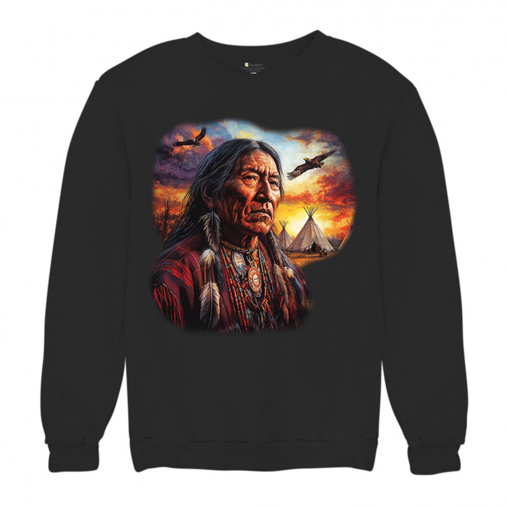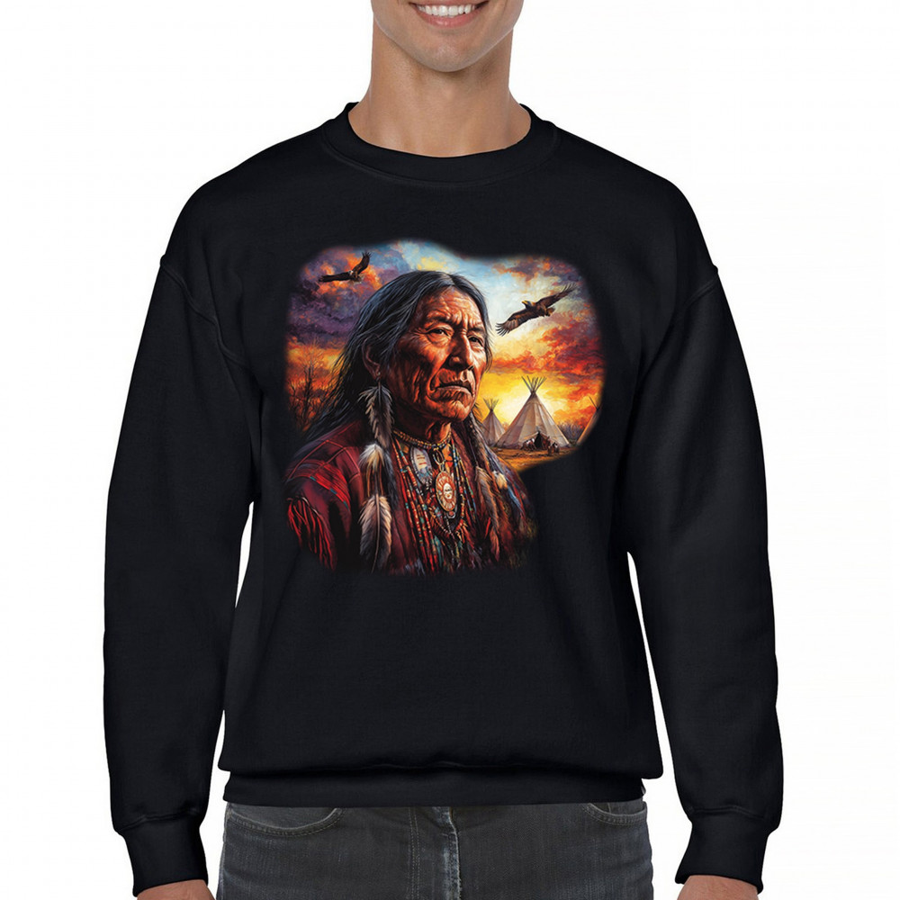 This vivid artwork features a Native American elder in traditional feathered attire, set before a blazing sunset with soaring eagles and peaceful teepees. The scene symbolizes strength, heritage, and spiritual wisdom. A heartfelt tribute to tribal pride, ancestral legacy, and cultural connection to land.