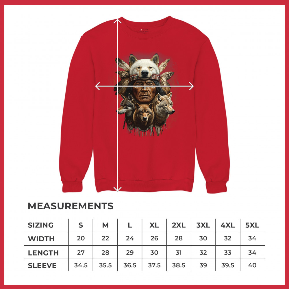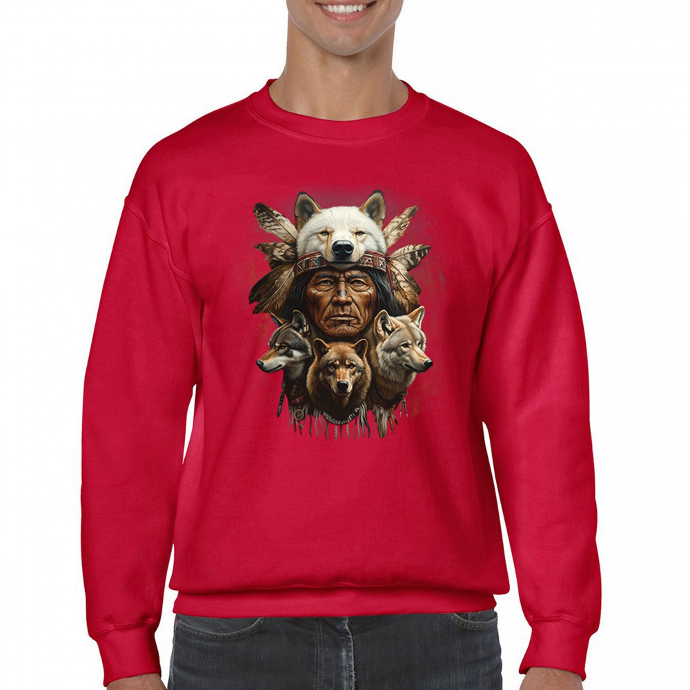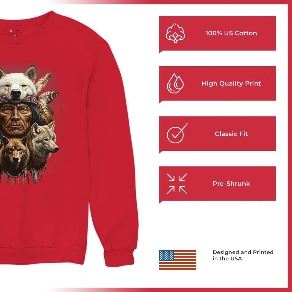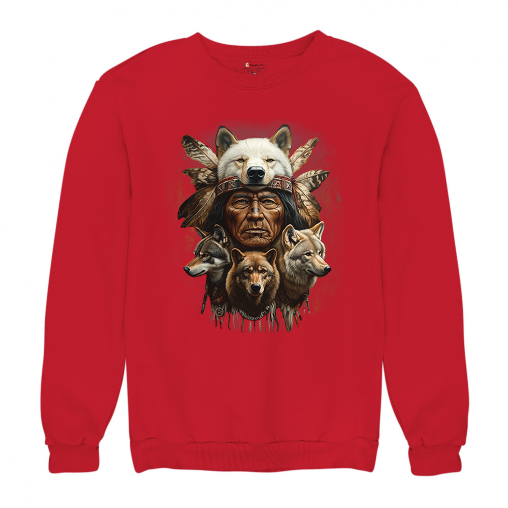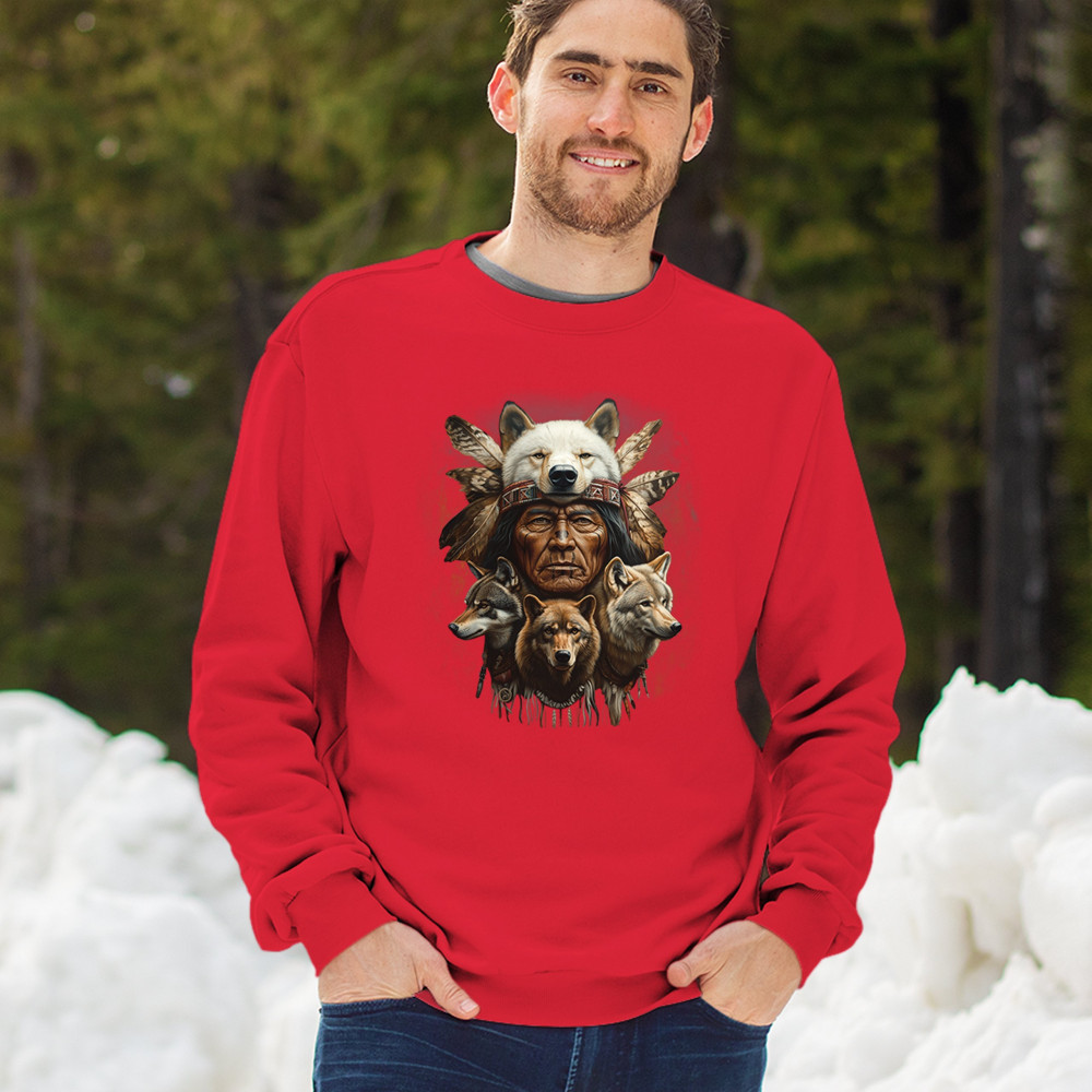 Wolf totem design with Native elder in headdress and guardian wolves. Symbolizes strength, loyalty, spirit animals, and tribal heritage.