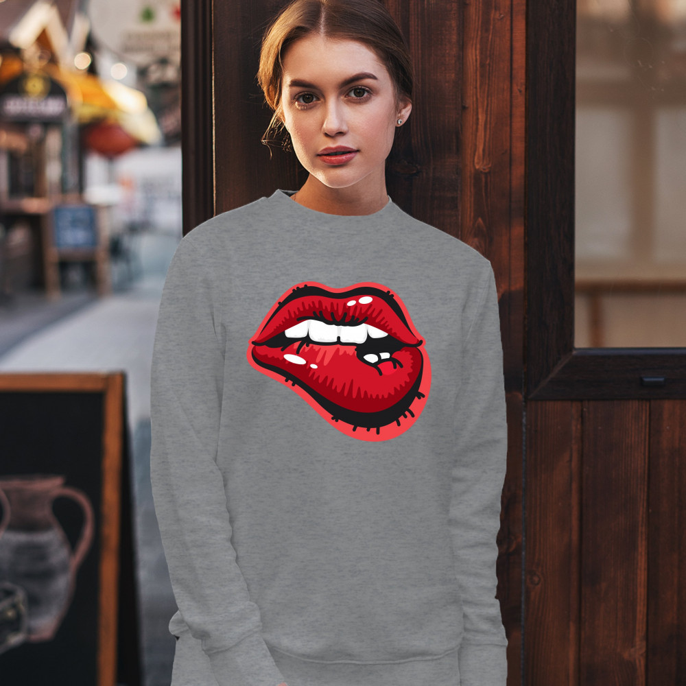 NAUGHTY BITING LIPS sweatshirt hot luscious sexy red lips crewneck gray