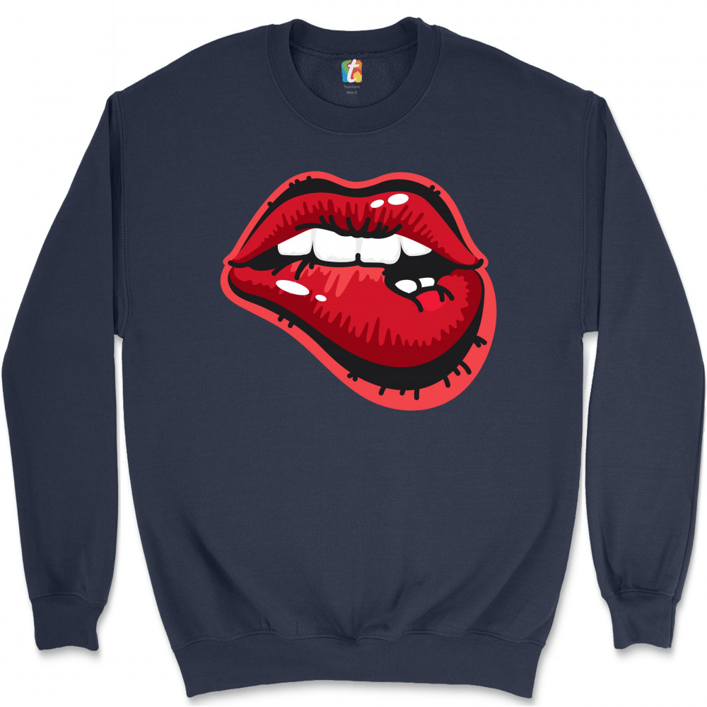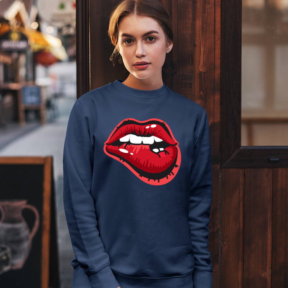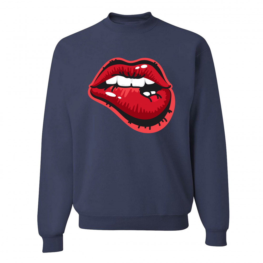 NAUGHTY BITING LIPS sweatshirt hot luscious sexy red lips crewneck navy blue