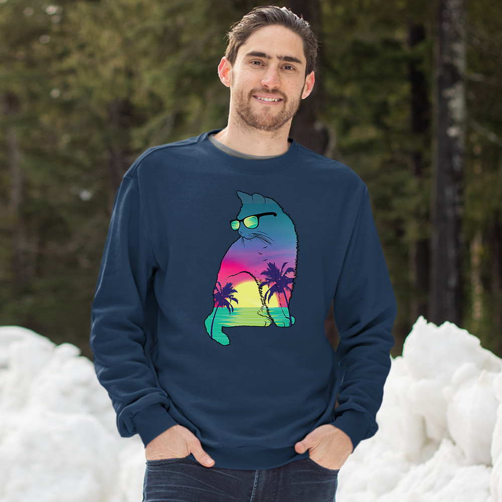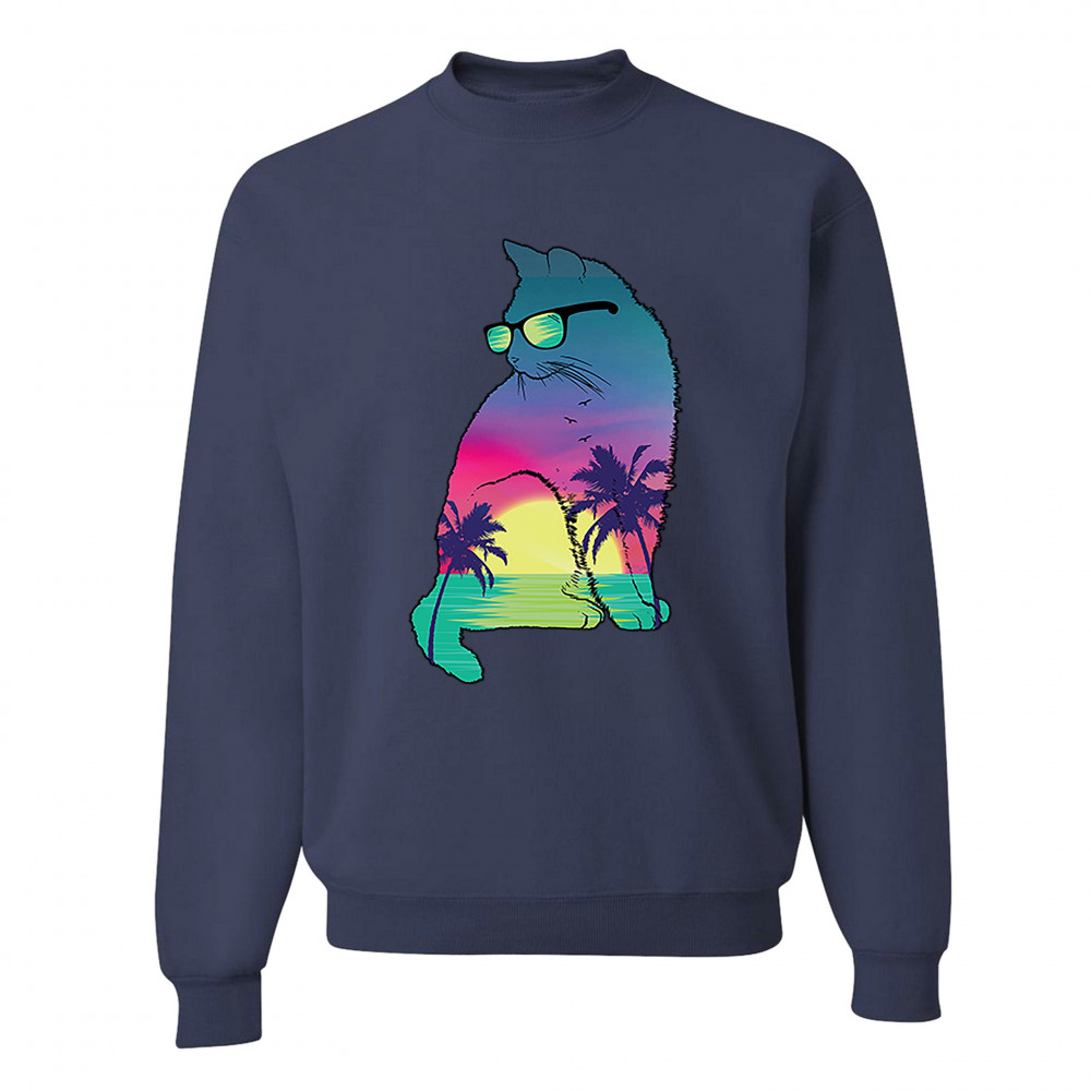 NEON CAT IN SUNGLASSES sweatshirt tropic kitten summer beach kitty crewneck navy blue